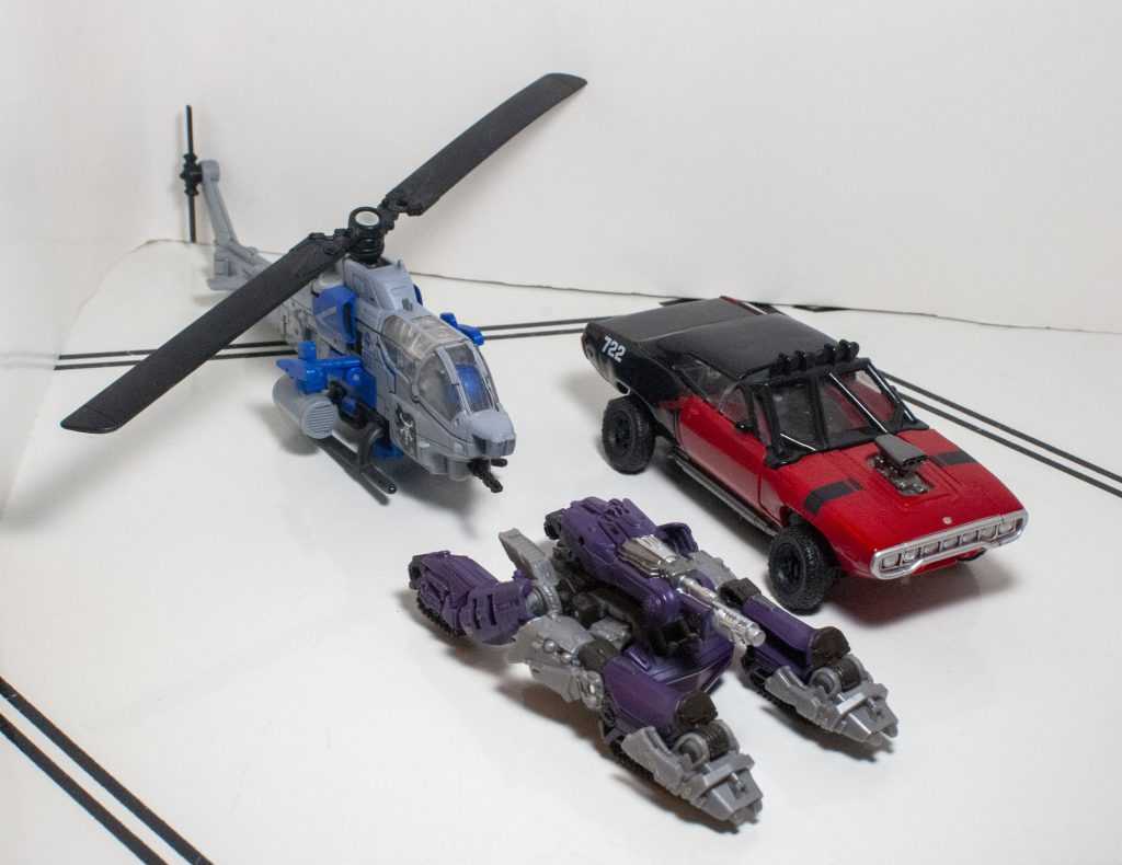 On the positive side, these colors are impressively screen-accurate for his size, he’s really just missing some accents on his legs (which are barely seen in the film), and they even added a silver border to his chest, for an extra pop of color. It’s not a bad look at all, it’s just a very “this is exactly what Shockwave always is” kind of look.