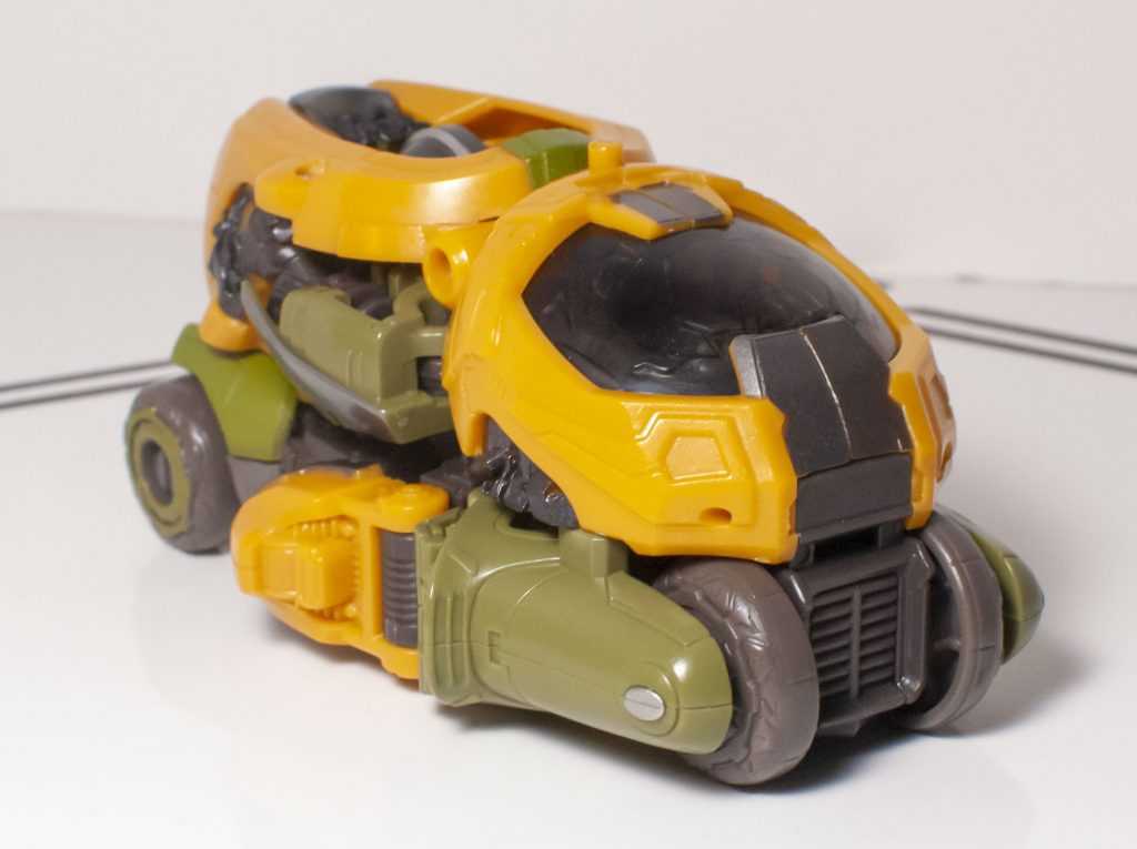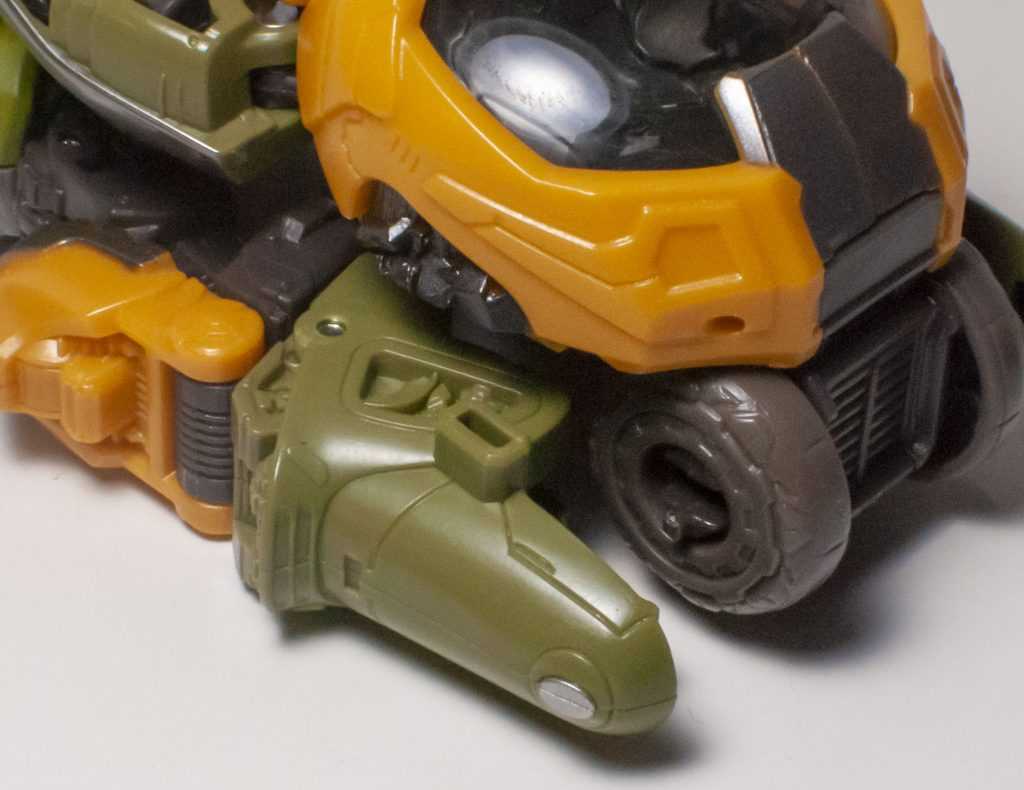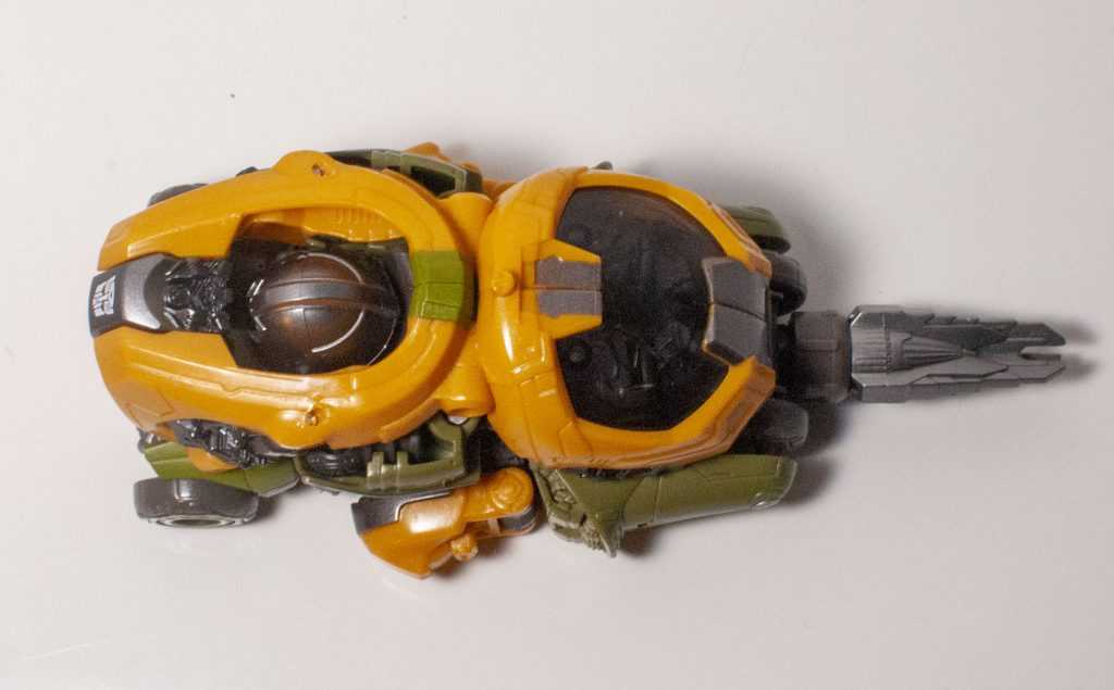 Brawn changes into a small, adorable, rounded, bug-like rolling vehicle. Out of all the made-up Bee Movie Prologue vehicle modes, this is by far my favorite, and it’s an inventive use of the shapes they already had. I particularly appreciate the wheels they added to this mode, in that they’re sculpted to have visual continuity with Bumblebee’s Cybertron mode wheels, like the rest of the rolling vehicles in this line.