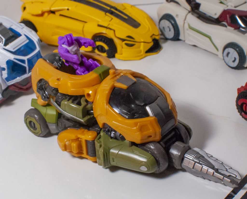For features, this drilling vehicle rolls impressively well. Like, better than the other vehicles in this line. His fellow Cybertronian cars sometimes have undercarriage that drags, or wheels that are on tightly enough that they don’t all spin, but this guy’s wheels are particularly loose (in a good way), and you can get some serious momentum off him from just a little push.