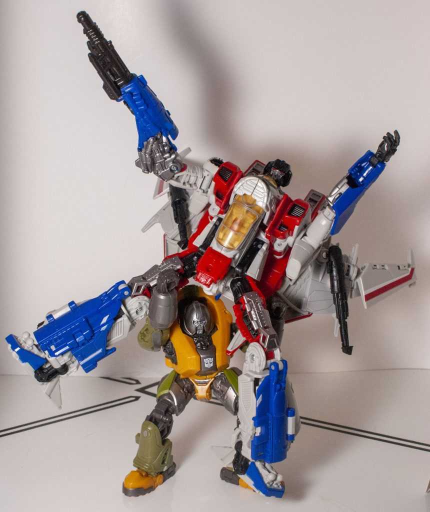 This is a clever one, and more importantly, is intuitive enough that I remembered it after one go. Basically, you rotate the waist, unfold his cockpit from his back, then fold him in half backwards at the waist, while fussing with his limbs. I think my favorite part of this is what happens to his feet and shins, they kinda go inside-out on themselves.