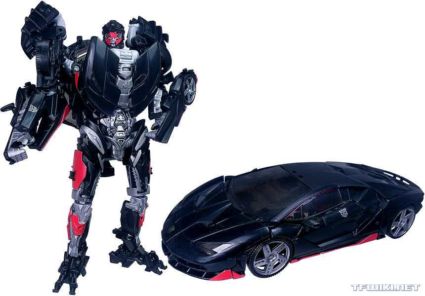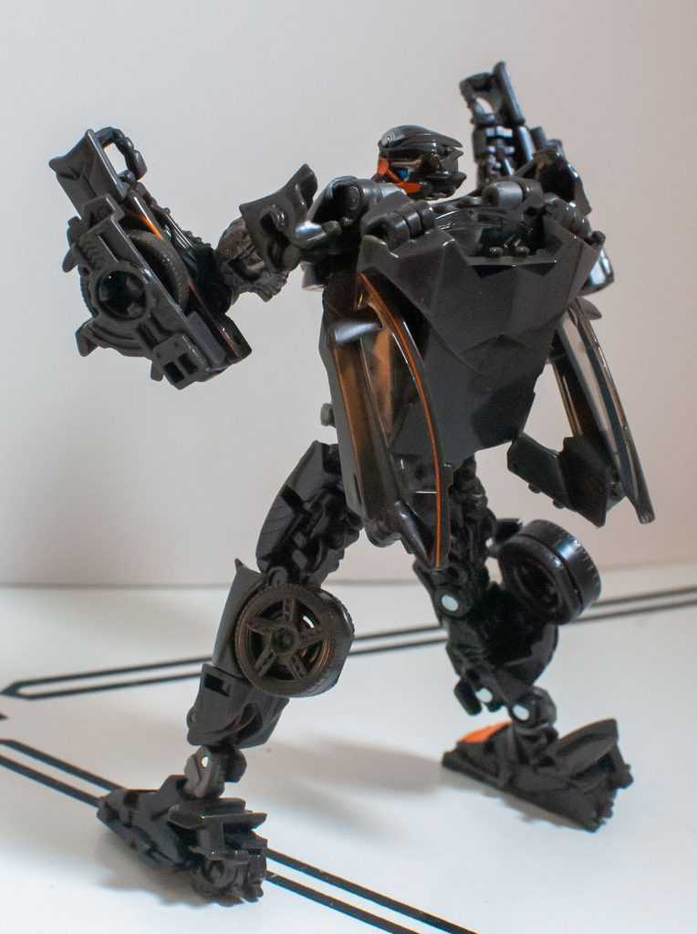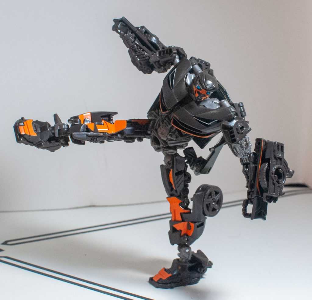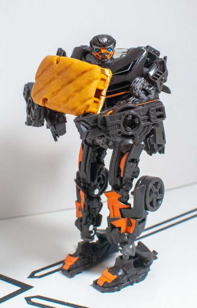 For colors, Hot Rod is black (or rather, various extremely dark shades of gray and brown, with some black bits), with bright orange highlights. The colors are one place where, even with the way Bay-bot designs kind of blur into themselves, I can tell they had to deviate from the screen design, because they definitely had a lot more orange on their arms and legs and backpack in the film. Though, looking at clips and photos from the movie, it seems like the CGI model just straight-up had black Lamborghini parts change colors to orange on the robot mode, so the designers *really* had an impossible task here.