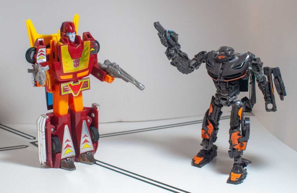 And that’s to say nothing about all the tiny bits of tech detailing on their character model that the toy leaves unpainted gray. At this scale, at mainline price, though, there was no way it was going to have all that color. It’s the same problem I said way back in my Studio Series 2007 Optimus review: Bayverse designs just had too much going on colors-wise to do on a standard retail budget, and the best we can hope for is for the deco to hit the important highlights, which, luckily, Rod does. What’s here looks good, and sleek, and it pops nicely, especially the lone bit of blue on the eyes. It could almost pass for a homage to Dark Hot Rod, the rare exclusive G1 repaint, colors-wise, though I’m really reaching to find a homage there.