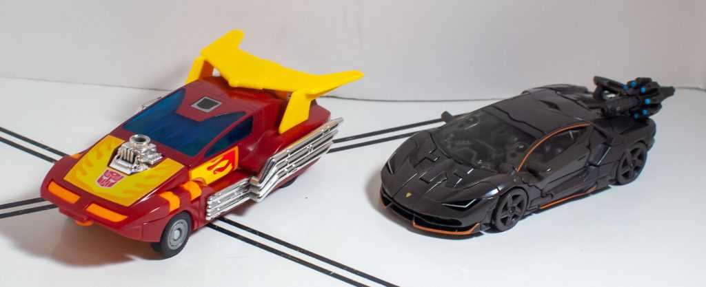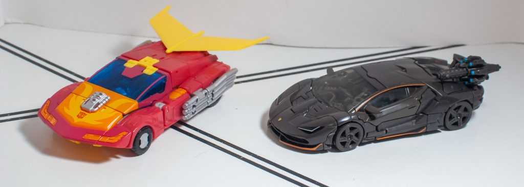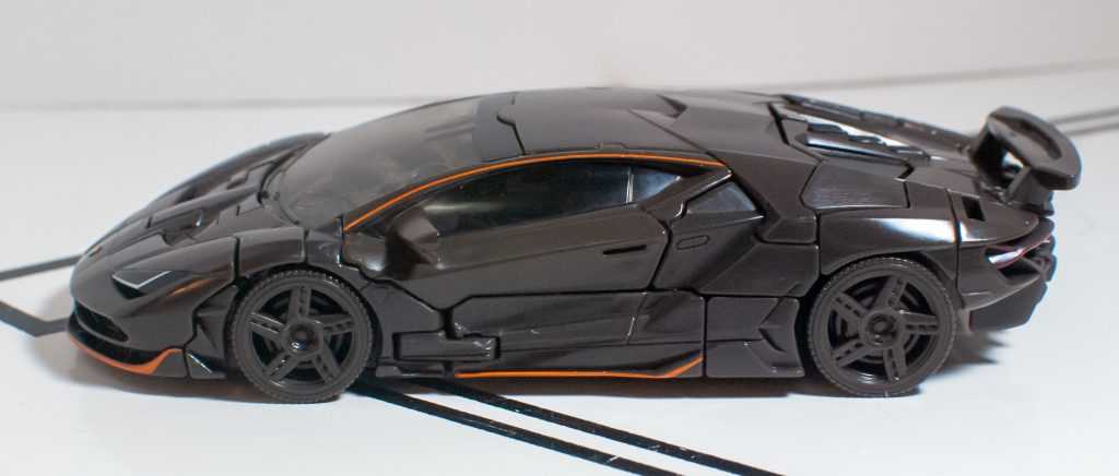 Hot Rod’s much more screen-accurate in this form, changing into a sleek black Lambo, with a little spoiler in the back. Granted, it’s a Lambo that’s absolutely riddled with seams and panel lines due to the transformation, but what’re you gonna do, it comes with the territory. I do find myself squeezing the seams below the door windows, though, in an attempt to make them more flush than they are.