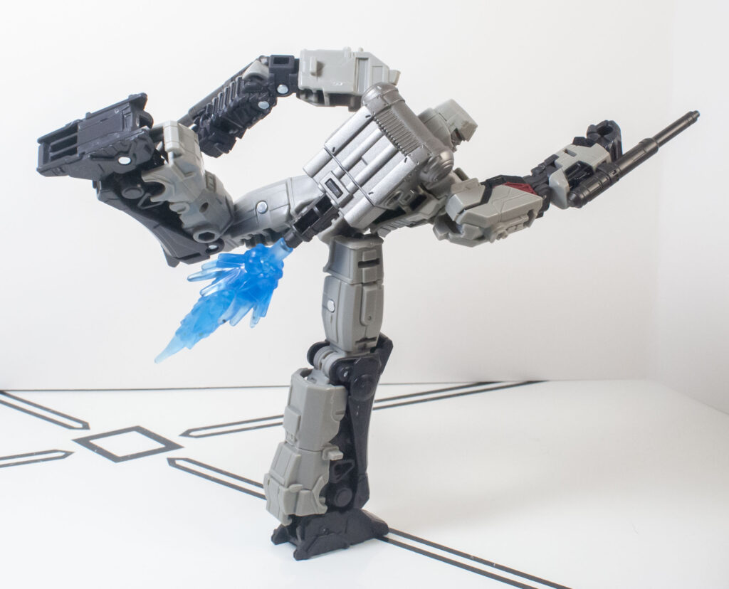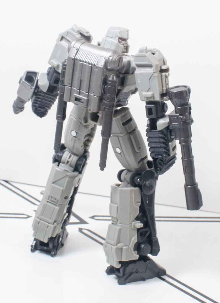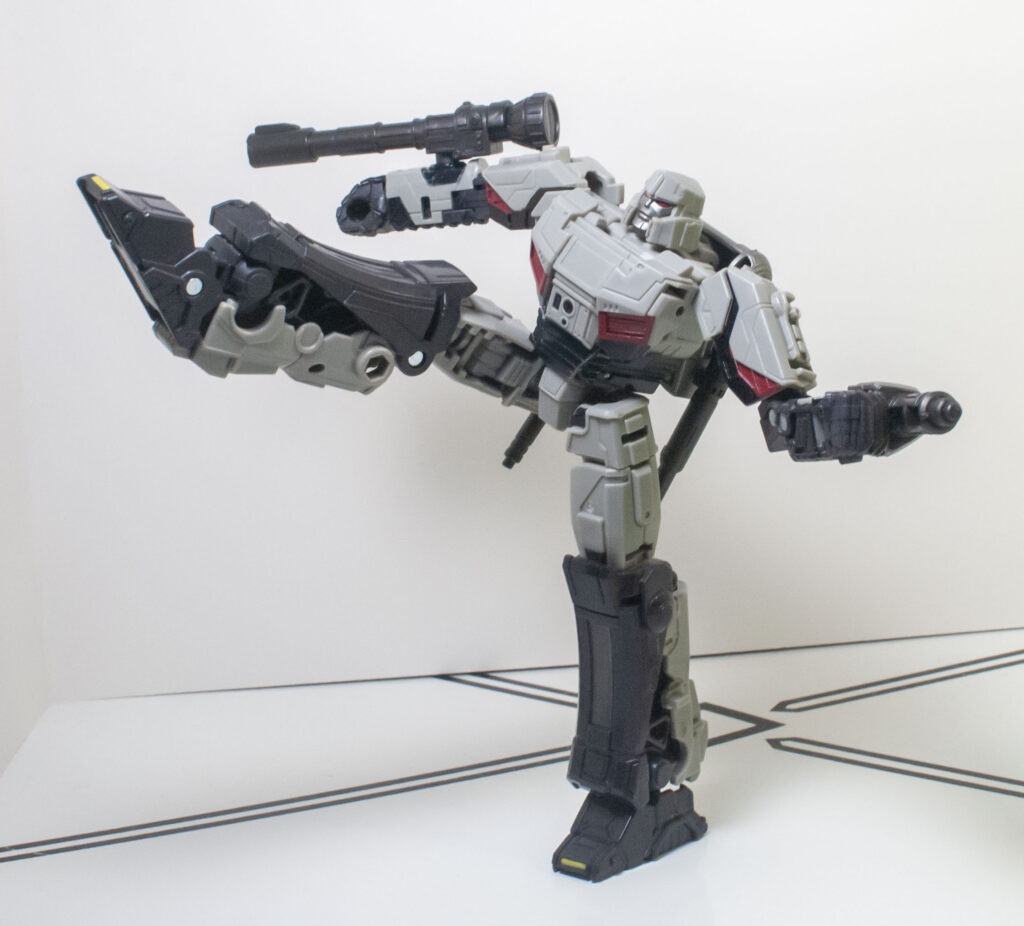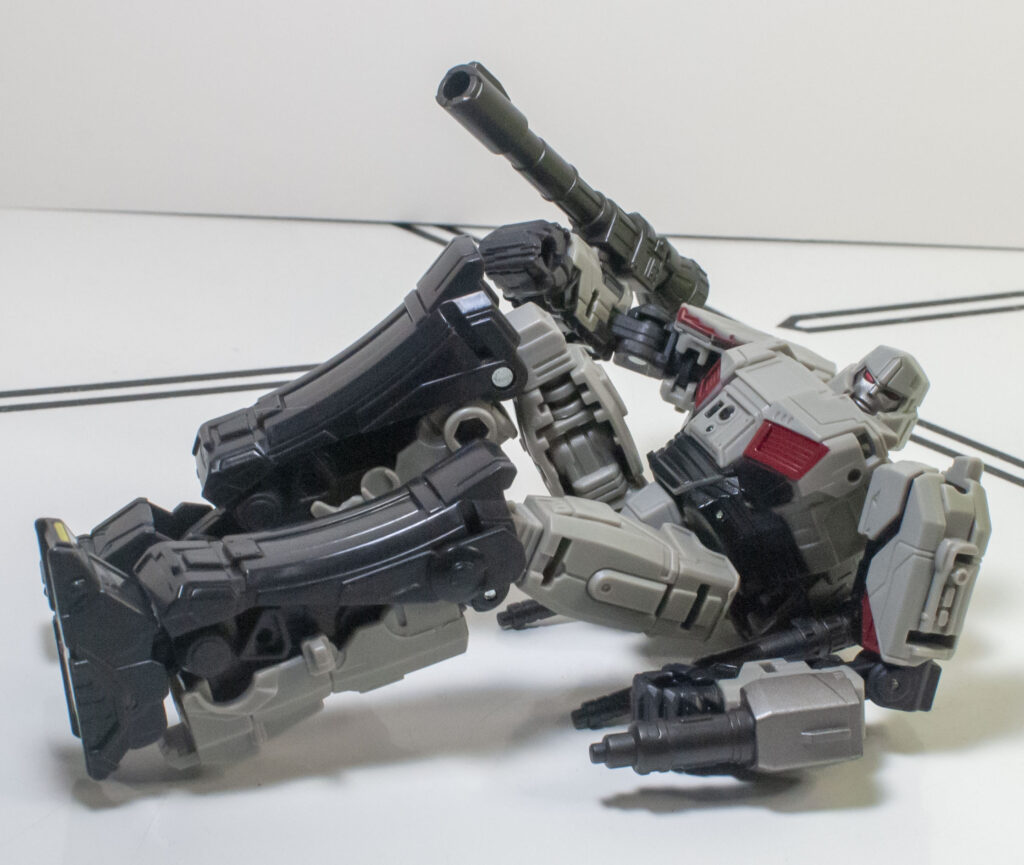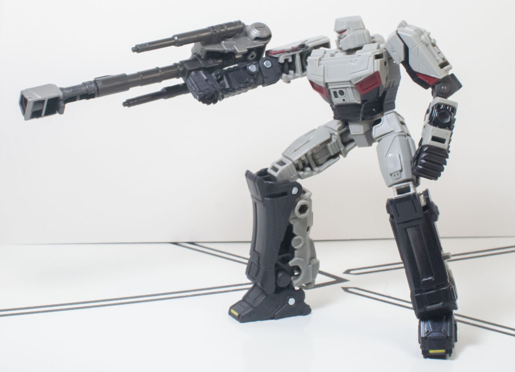 Megatron’s build quality is, frankly, extremely impressive, especially after how hit and miss it was on Optimus. First of all, despite his skinny proportions, he’s got a bit more mass and density than you’d expect. But more importantly, all of his joints are nice and tight, and he’s got a general feeling of sturdy solidity to him that’s hard to define, but definitely appreciated. One interesting thing about how he’s built is his knee joints, which lock into a straight position with a click, and need to be unclipped to be posed.
