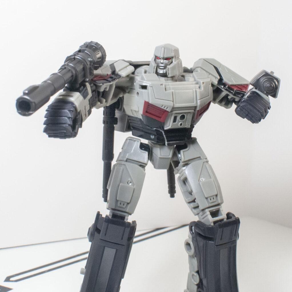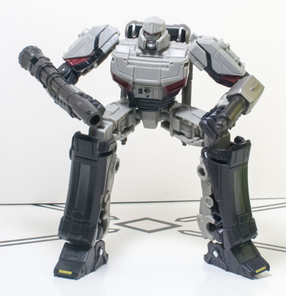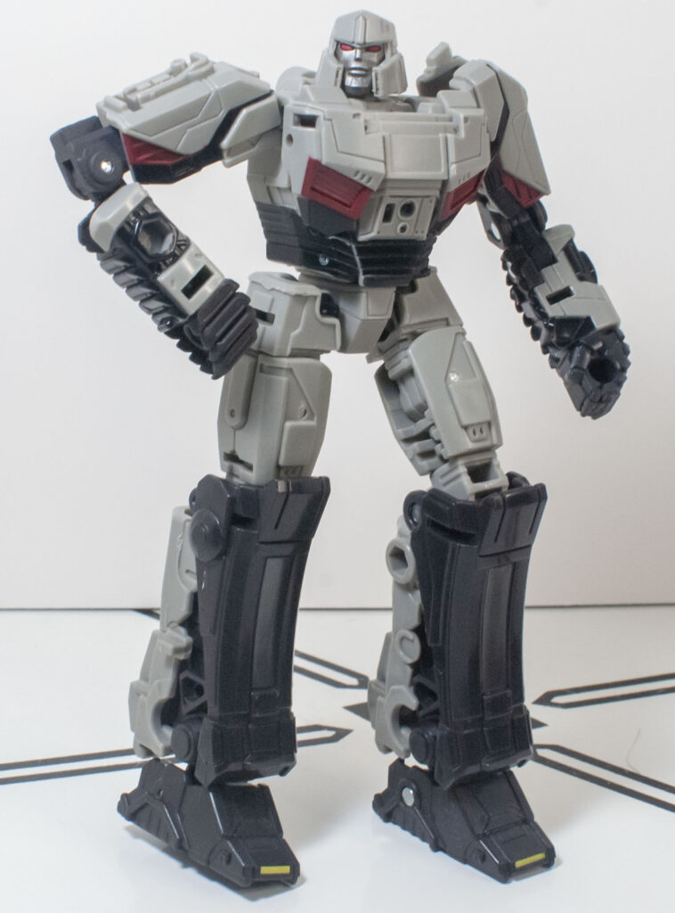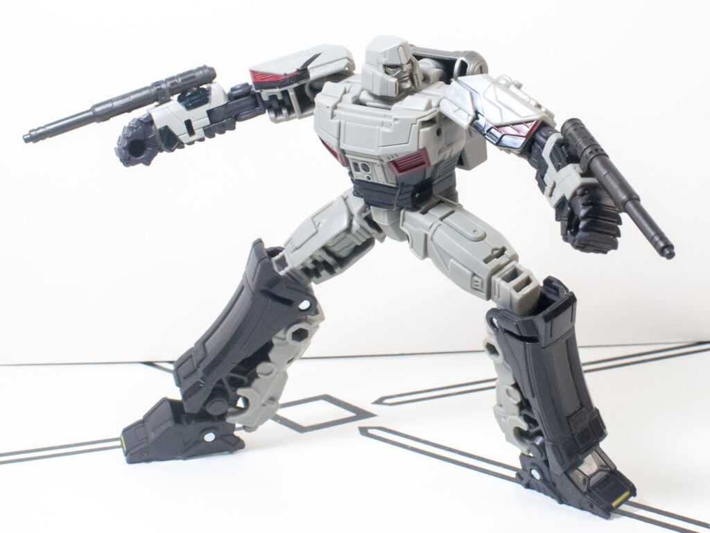 Megatron’s build quality is, frankly, extremely impressive, especially after how hit and miss it was on Optimus. First of all, despite his skinny proportions, he’s got a bit more mass and density than you’d expect. But more importantly, all of his joints are nice and tight, and he’s got a general feeling of sturdy solidity to him that’s hard to define, but definitely appreciated. One interesting thing about how he’s built is his knee joints, which lock into a straight position with a click, and need to be unclipped to be posed.