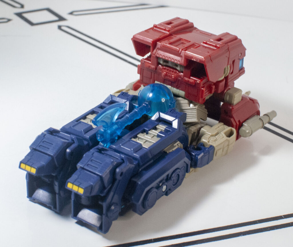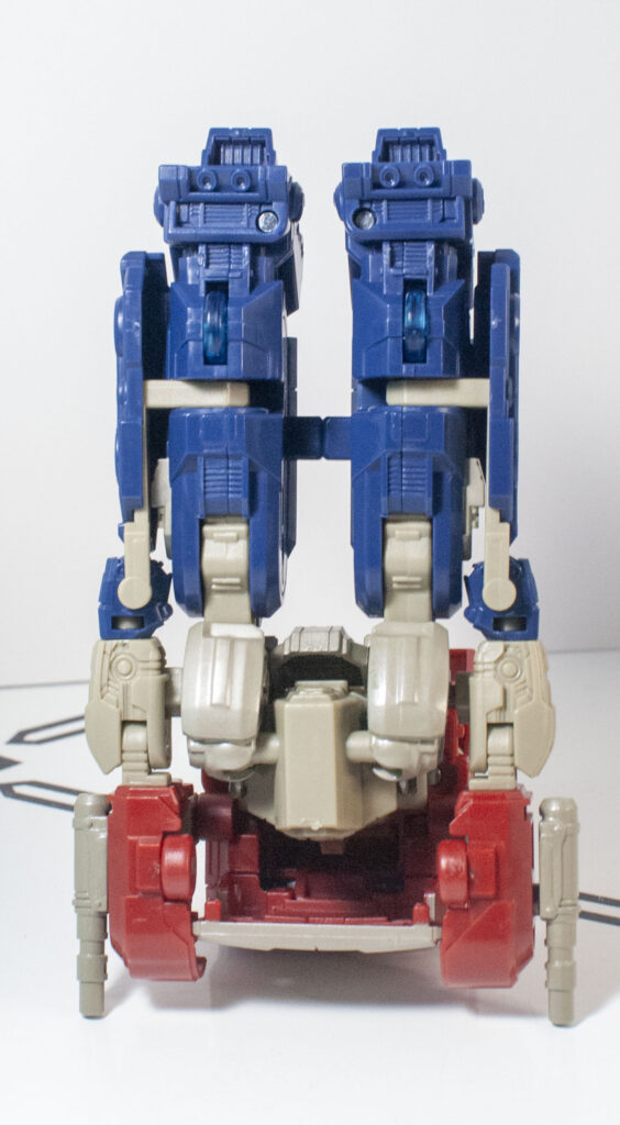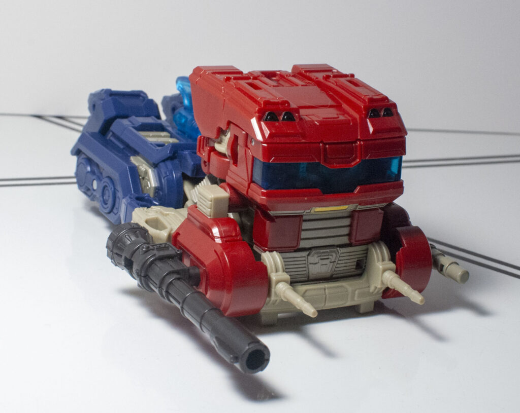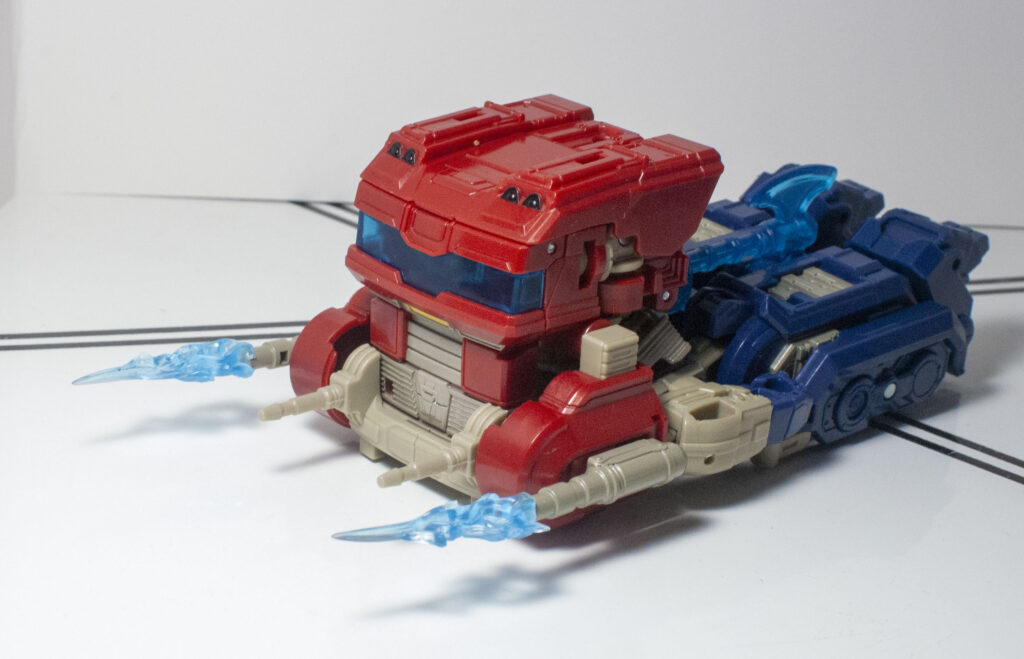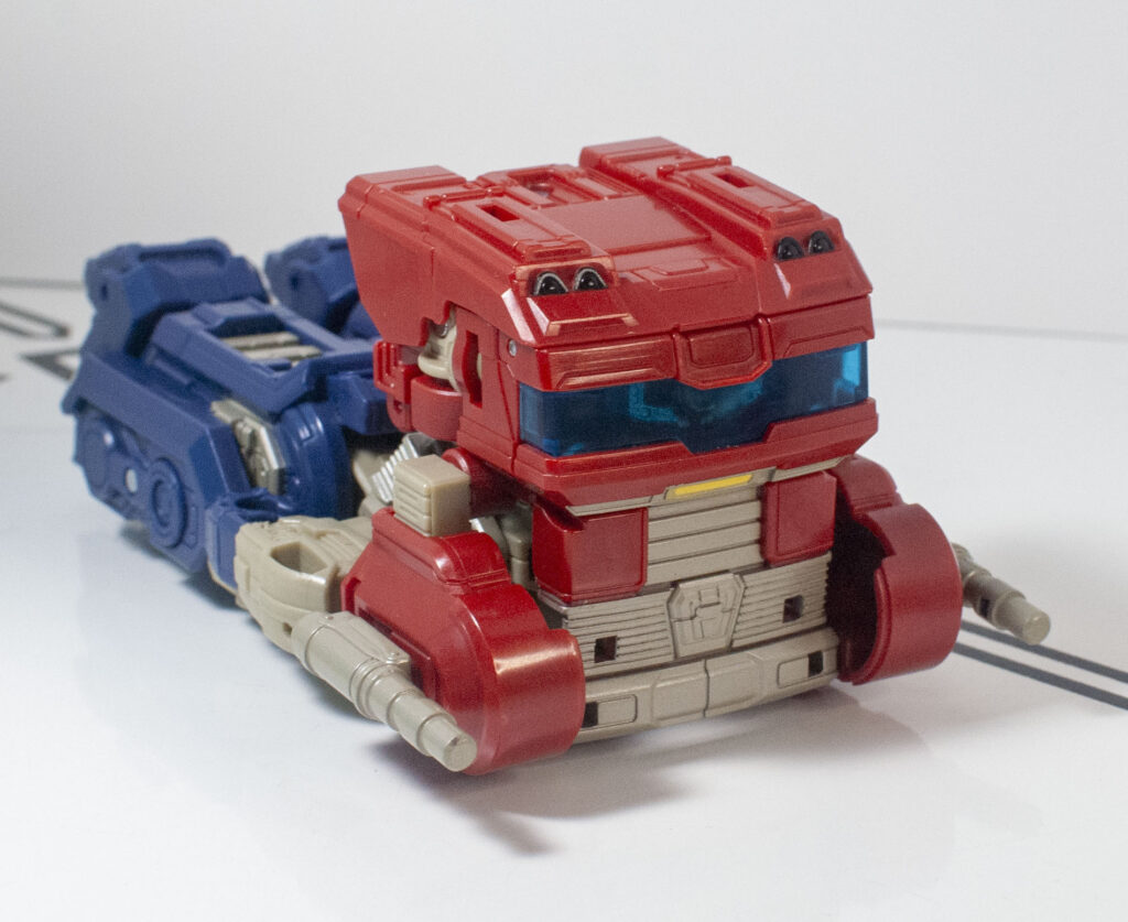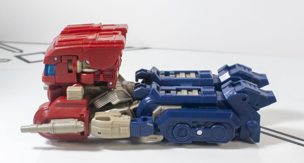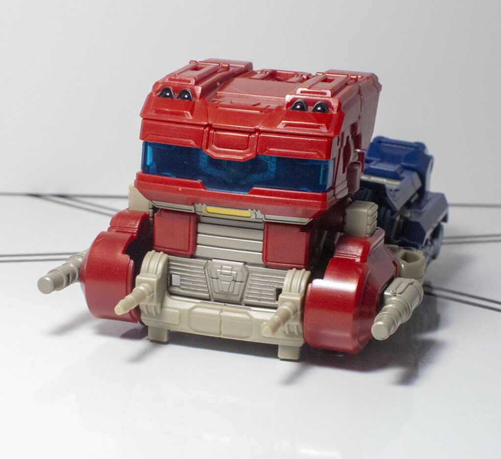 So, in the abstract, Transformers One Optimus transforms the same way most modern Primes do, which is to say, it’s mostly the G1 transformation, just with a waist twist to reverse the legs. The biggest difference here is that this Prime’s arms fold back towards the legs, instead of merging into the torso. The devil’s in the details, though, and those arms kind of cause trouble, as there’s a lot of tabs and holes you need to line up, and there’s a fair amount of massaging and fiddling involved, particularly when it comes to plugging the fists onto the little grips on his legs.