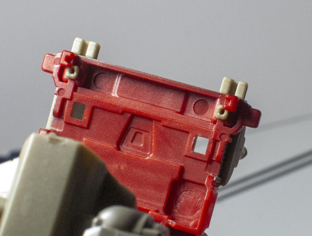 Lastly, there’s this rubbery gray bar, with a couple of spikes (or lasers?) sticking out that’s really meant for his truck mode, so all it does here is stash inside of his backpack panel….rather poorly.