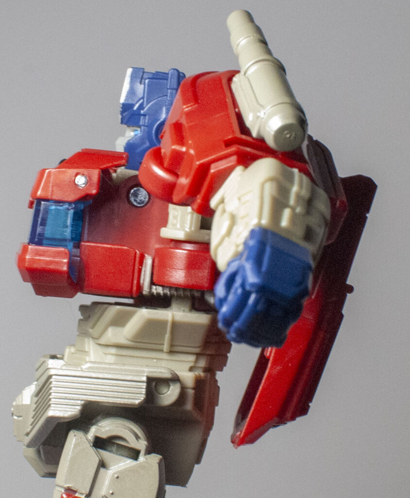 You can fit it over either one of his fists really well, or, if you need to stash it somewhere, clip it onto his backpack on a bespoke tab. Next up, he’s got an identical feature to Legacy Deluxe Optimus, where his smokestacks can rotate, or pop off of his shoulders to serve as little pistols.