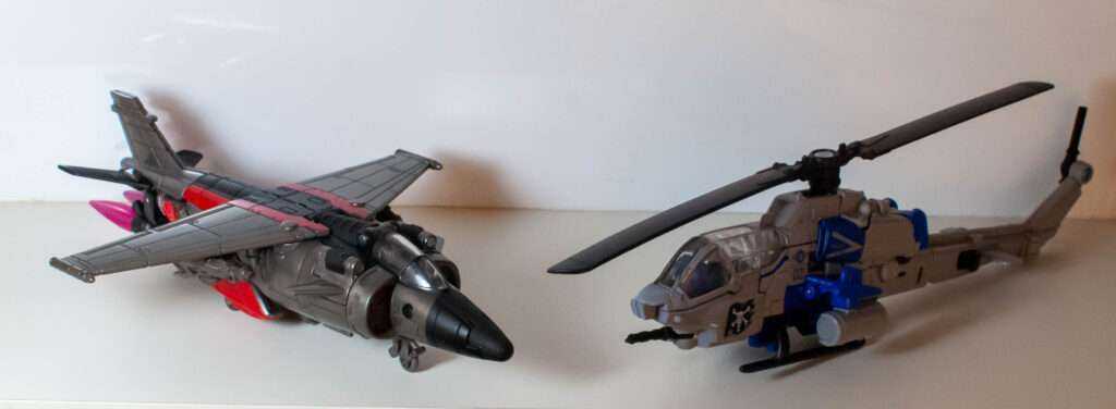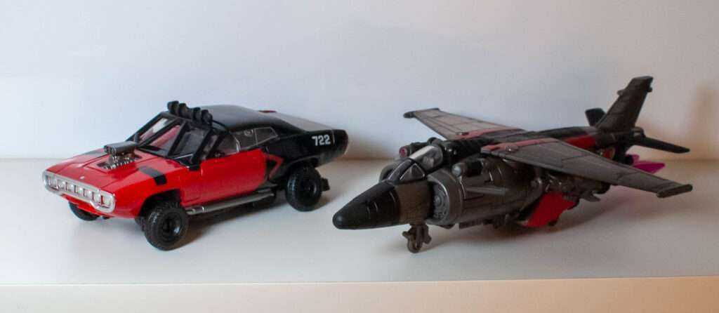 One thing I like about the transformation is that it tips this jet mode’s color balance from “50 percent red” to “50 percent silver,” giving her a different vibe in this form. I also dig the red and black stripes on the top of the body.