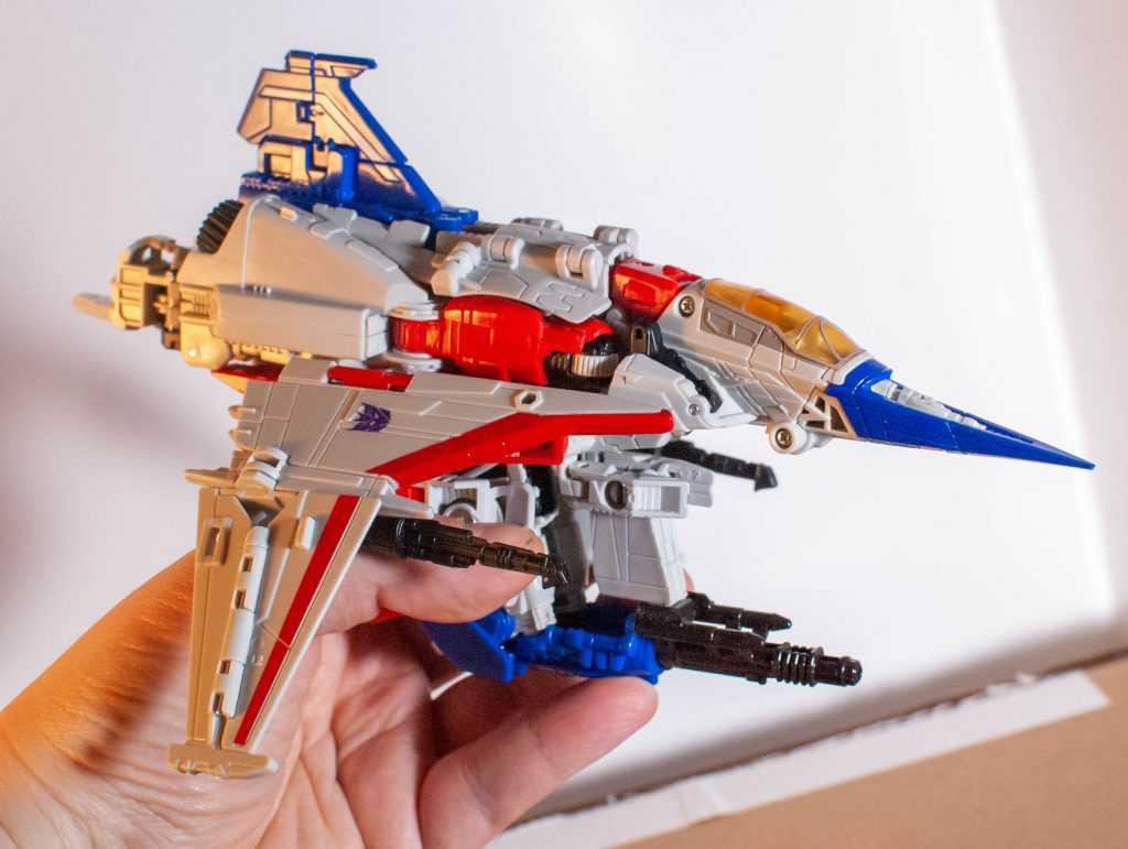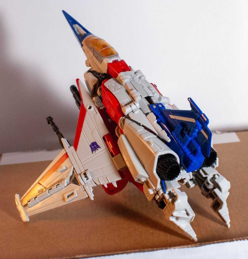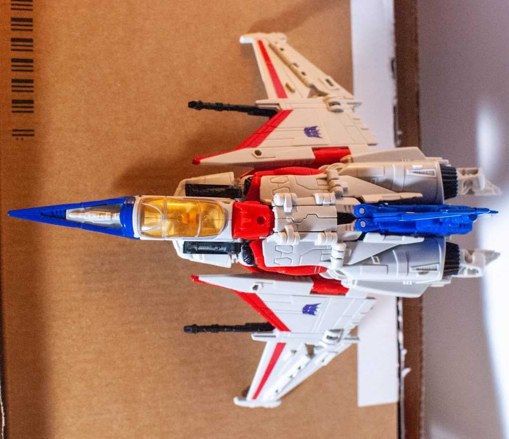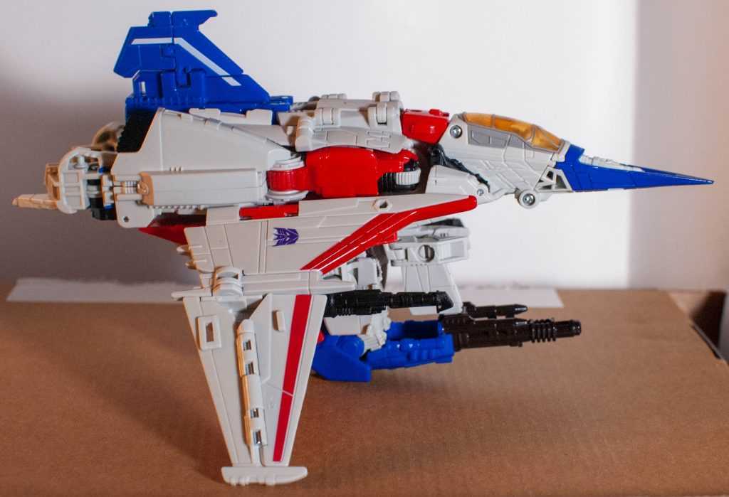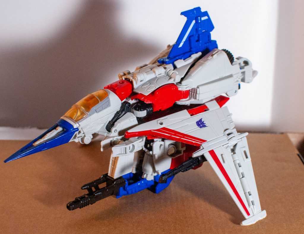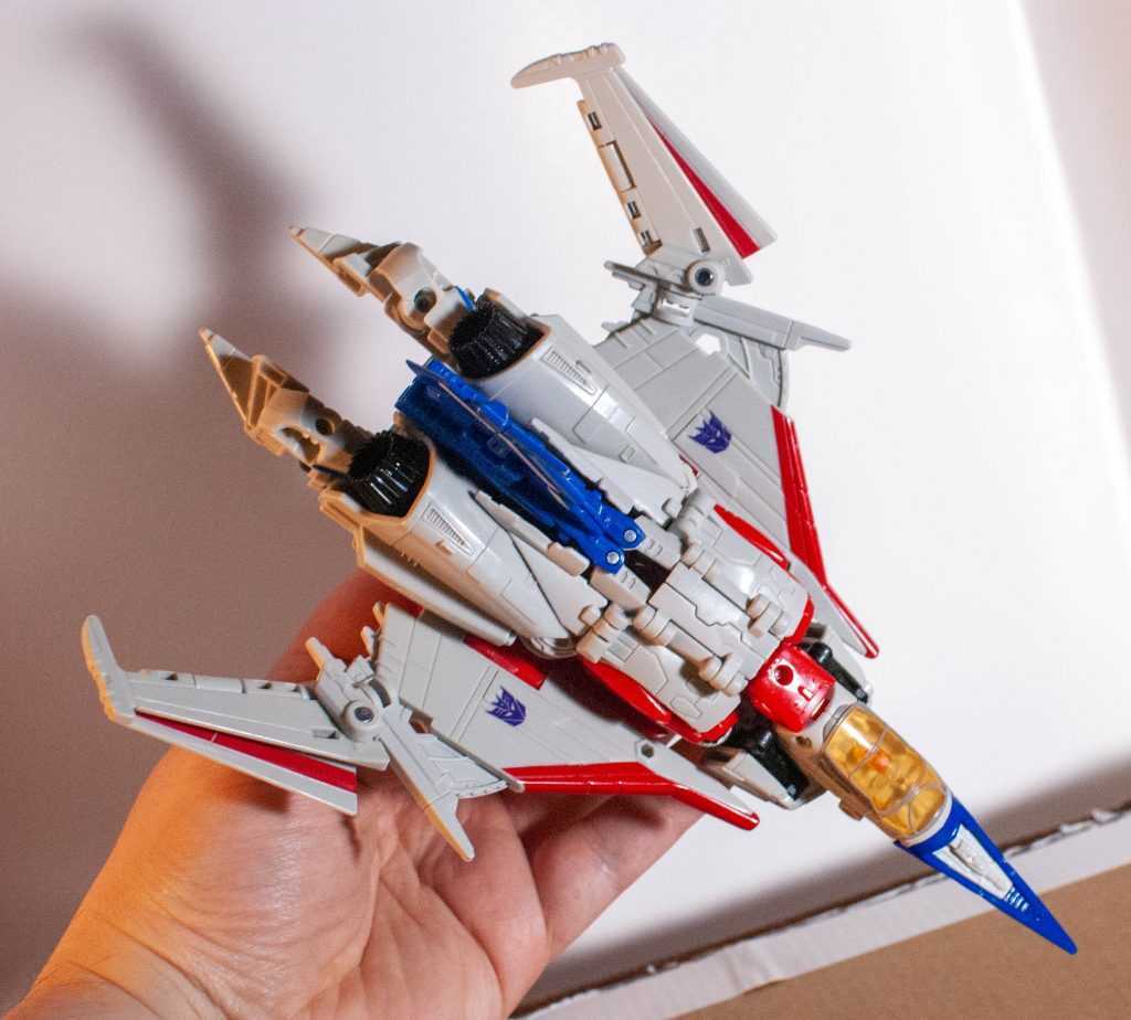 In this form, Starscream’s a reinvention of the classic Tetrajet design, last seen on the Siege Seekers.