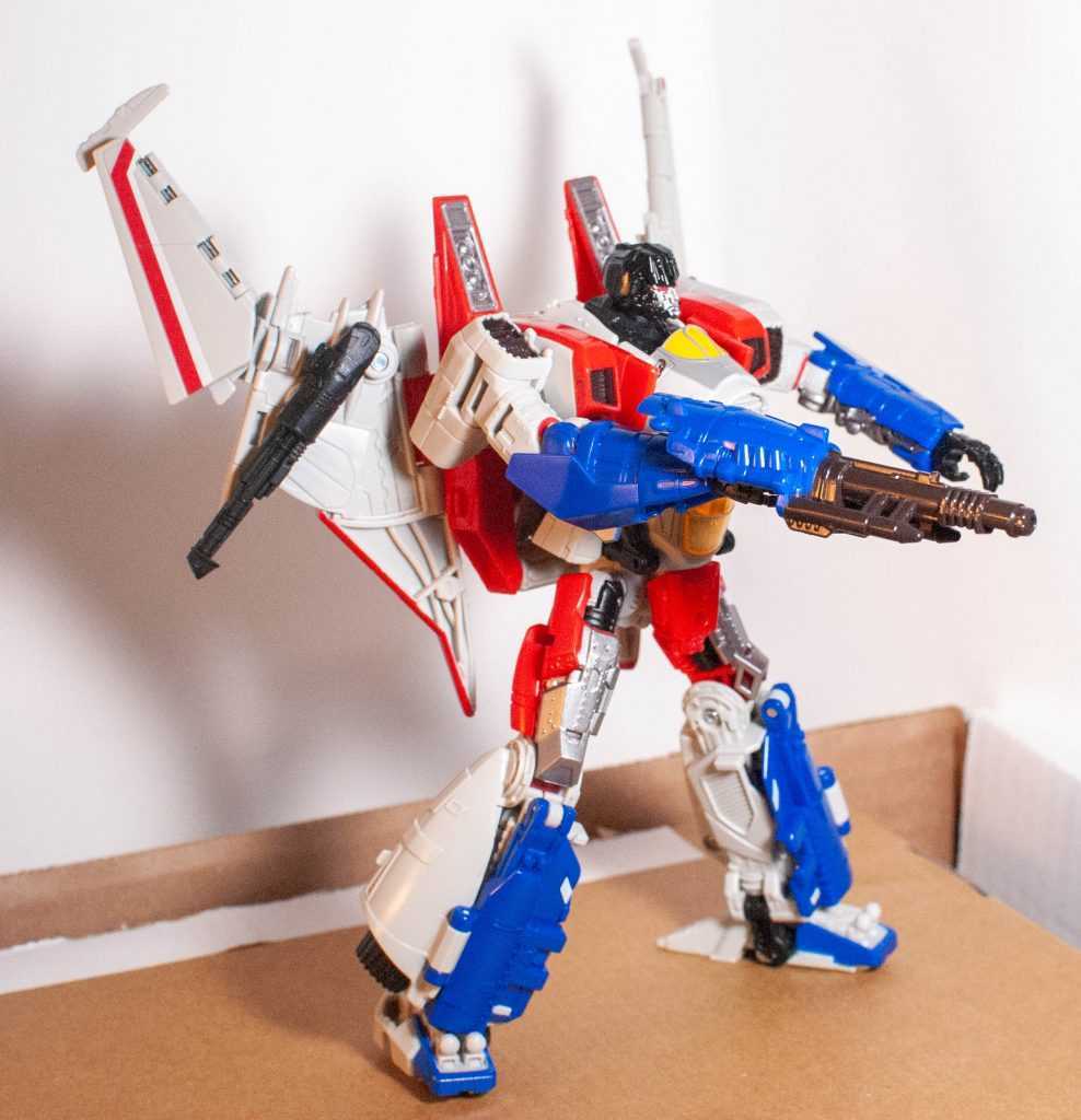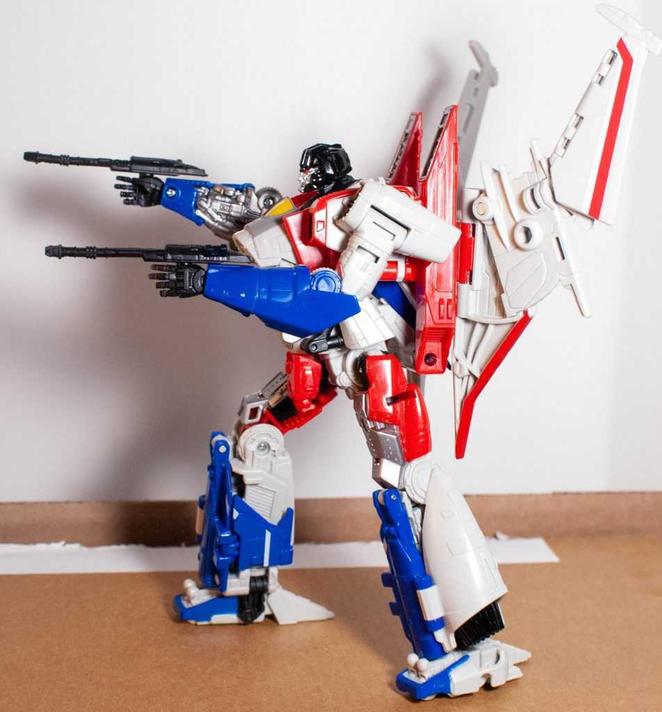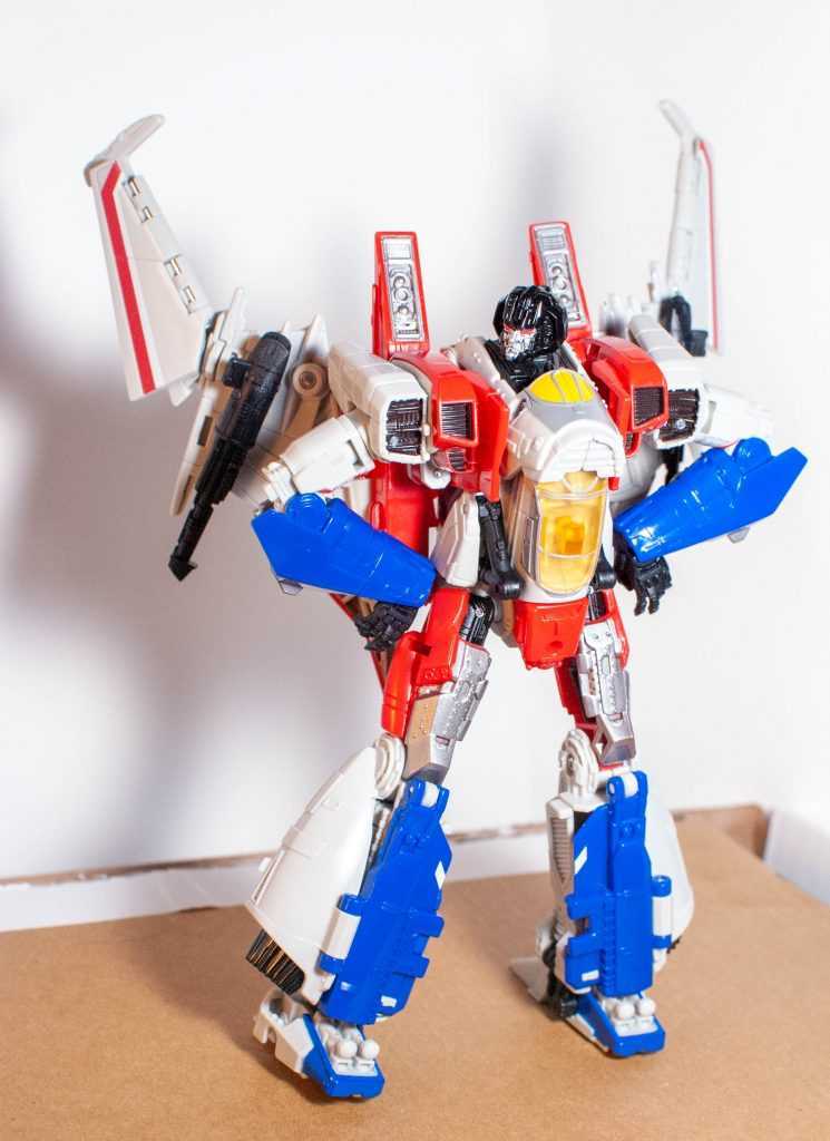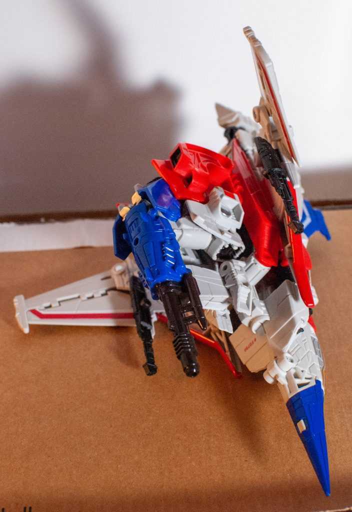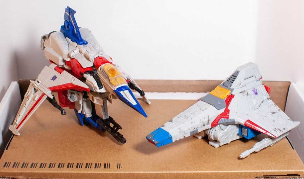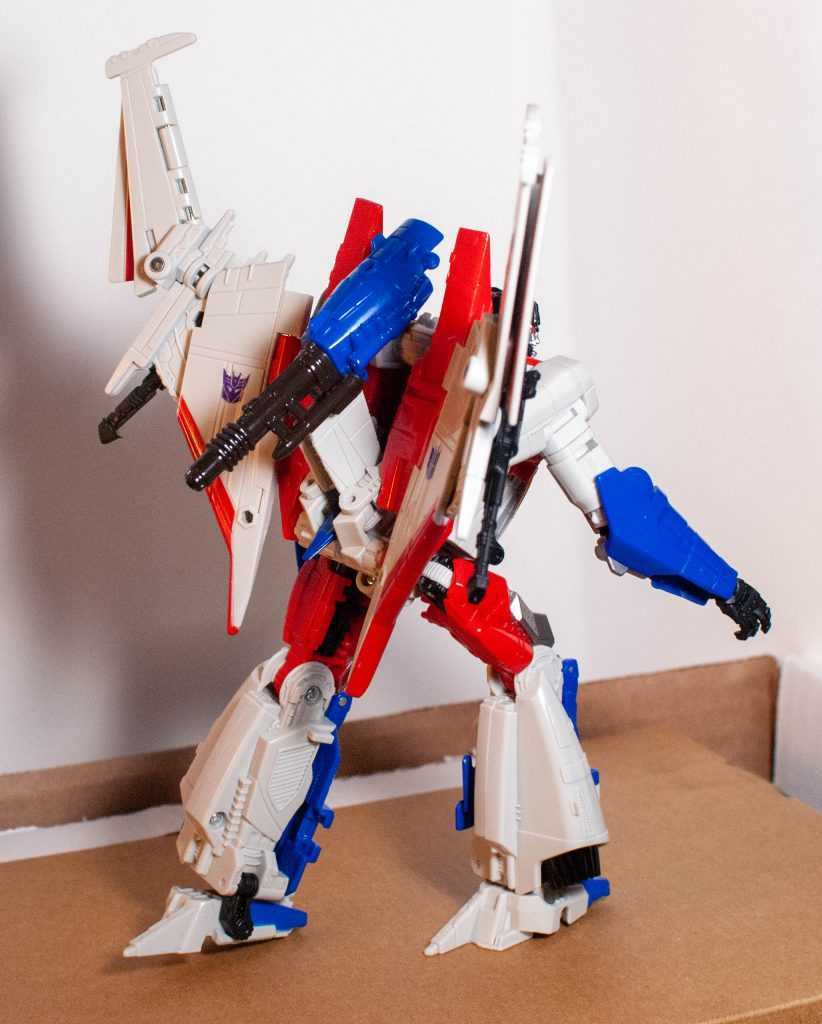 In this form, Starscream’s a reinvention of the classic Tetrajet design, last seen on the Siege Seekers.