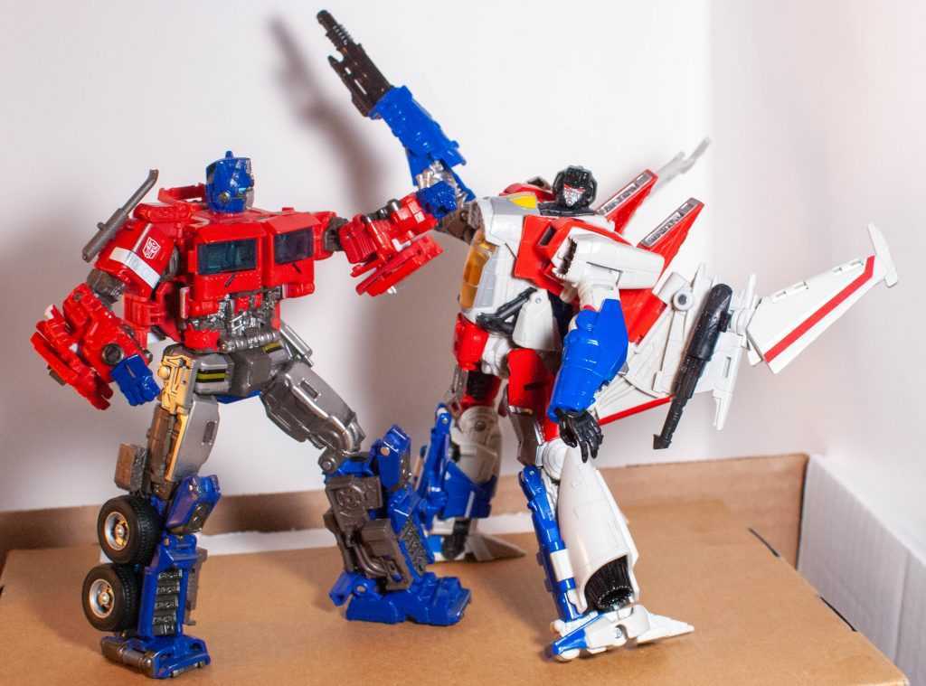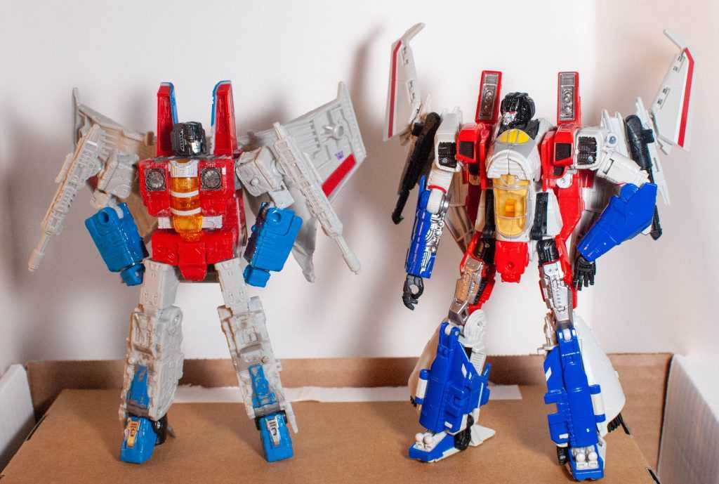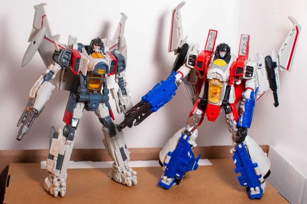 It’s still a bit funny looking at them side by side and seeing all the little details they share, though. Really specific details like orbs on his toes, the wheels around his cockpit, and those double-vented shoulders are directly copied. Screamer has larger wings, though, and pylons on his shoulders, and a million other smaller design differences, thanks to his Cybertronian nature.