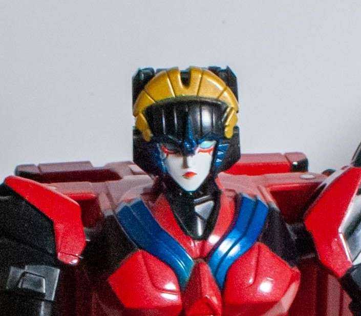 They may not have painted the Titan Master robot much, but they went wild on the deco on her robot face, with its white face, red makeup accents, blue eyes, blue head crest, and gold hair clip. There’s a lot of paint, but it all came out clean, fortunately, and looks really nice.
