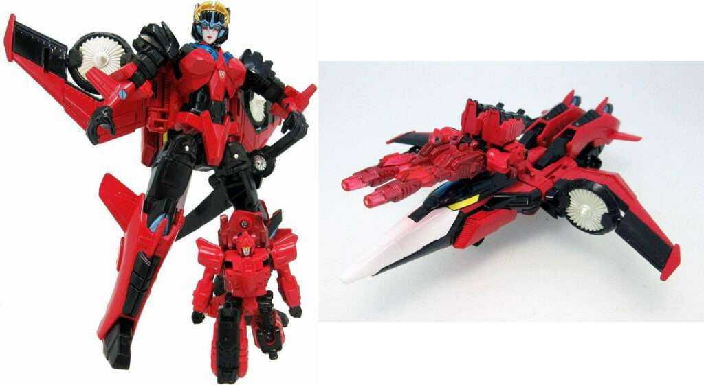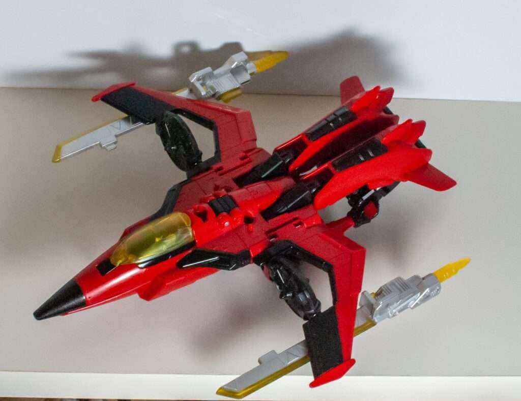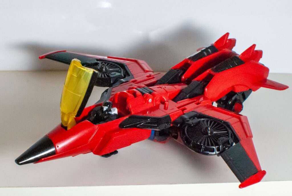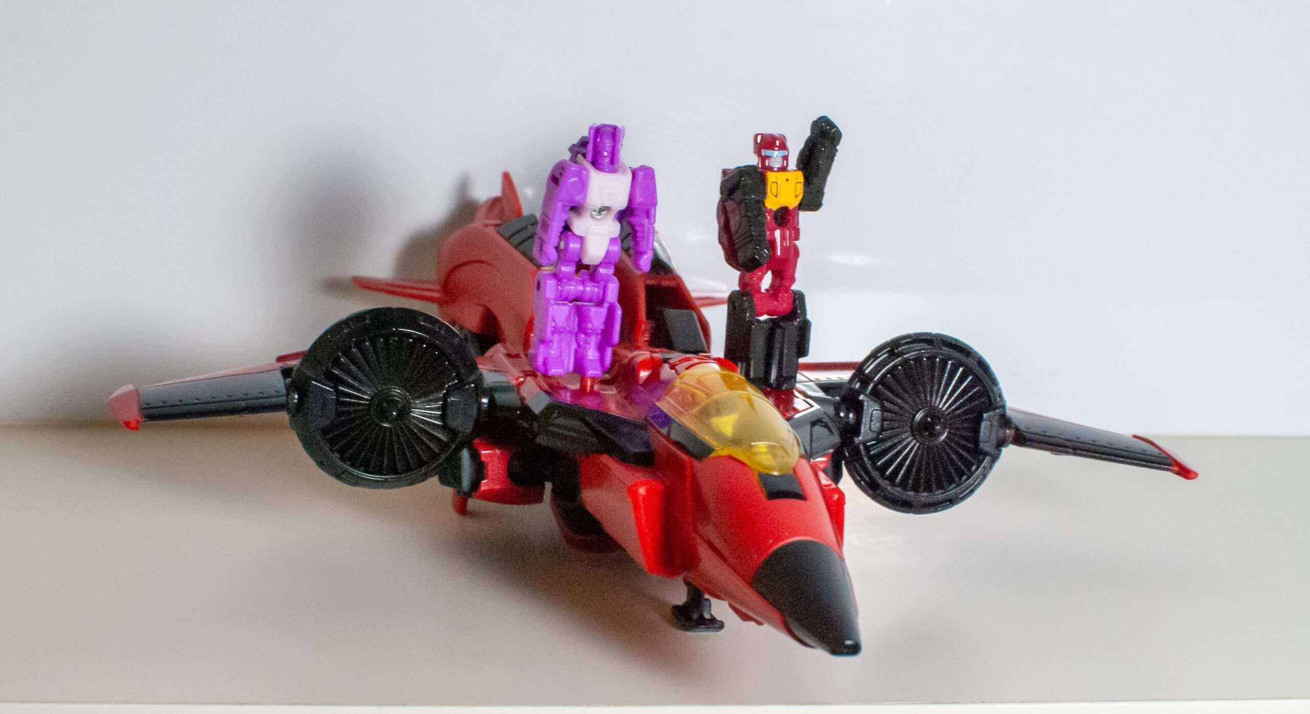 For features, firstly, Scorchfire can ride in her cockpit, though she tends to rattle around unless you press her in properly. Windblade also has a single tiny tab on either side of her jet body, for Titan Masters to perilously stand on her.