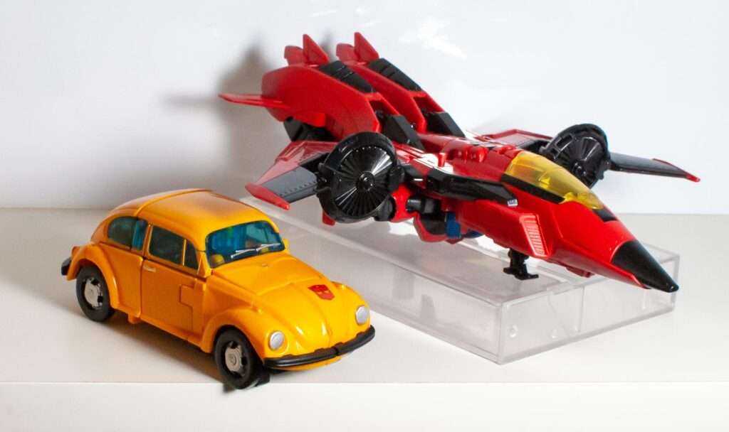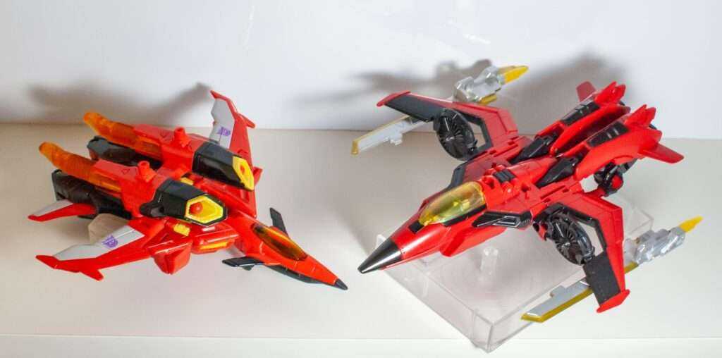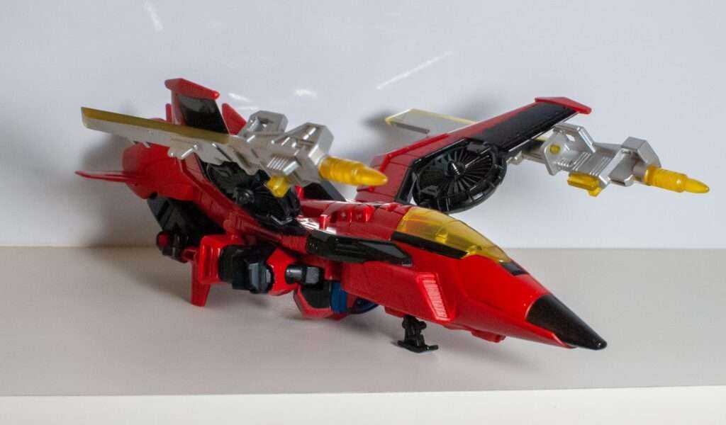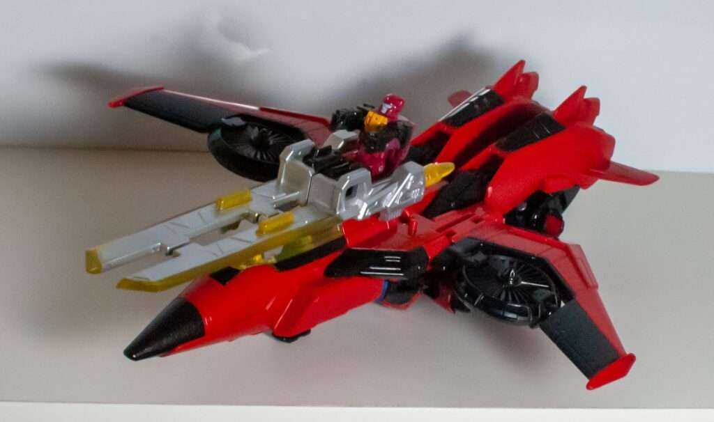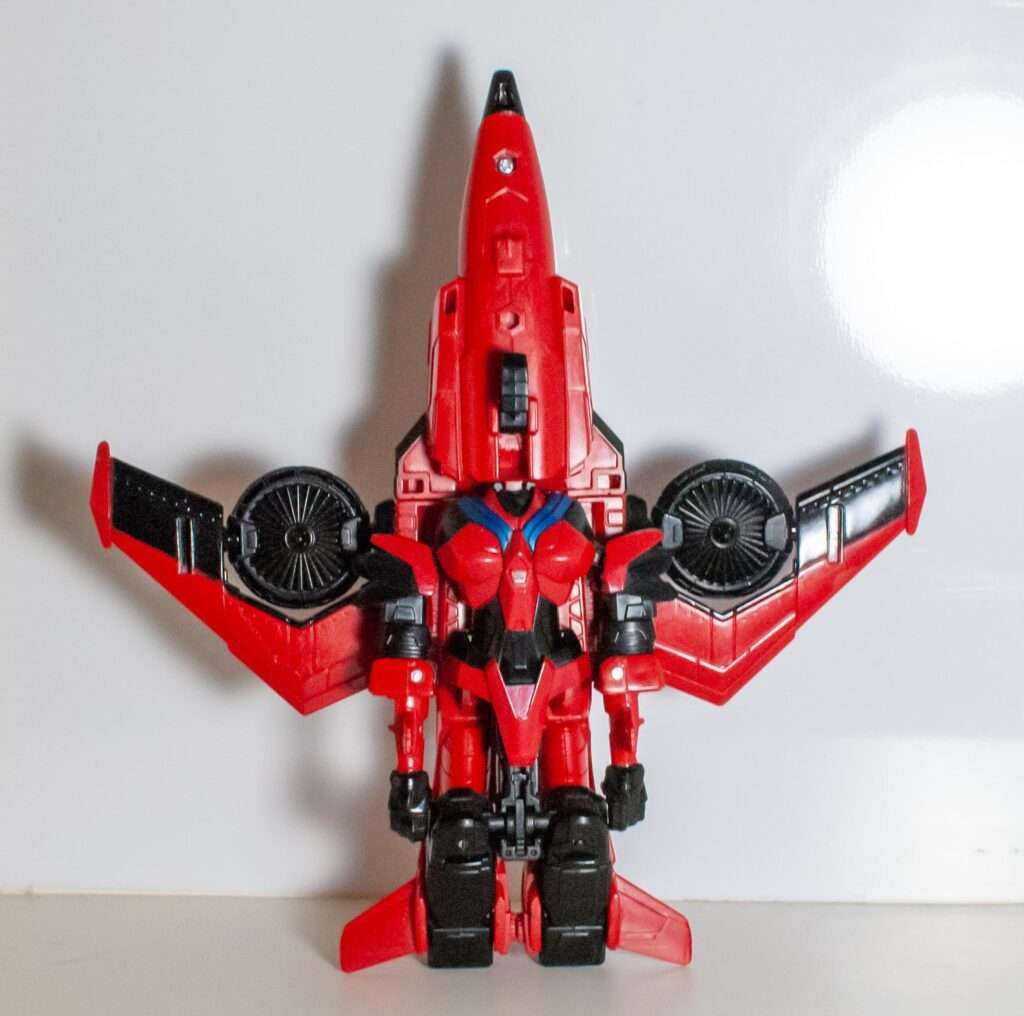 For features, firstly, Scorchfire can ride in her cockpit, though she tends to rattle around unless you press her in properly. Windblade also has a single tiny tab on either side of her jet body, for Titan Masters to perilously stand on her.