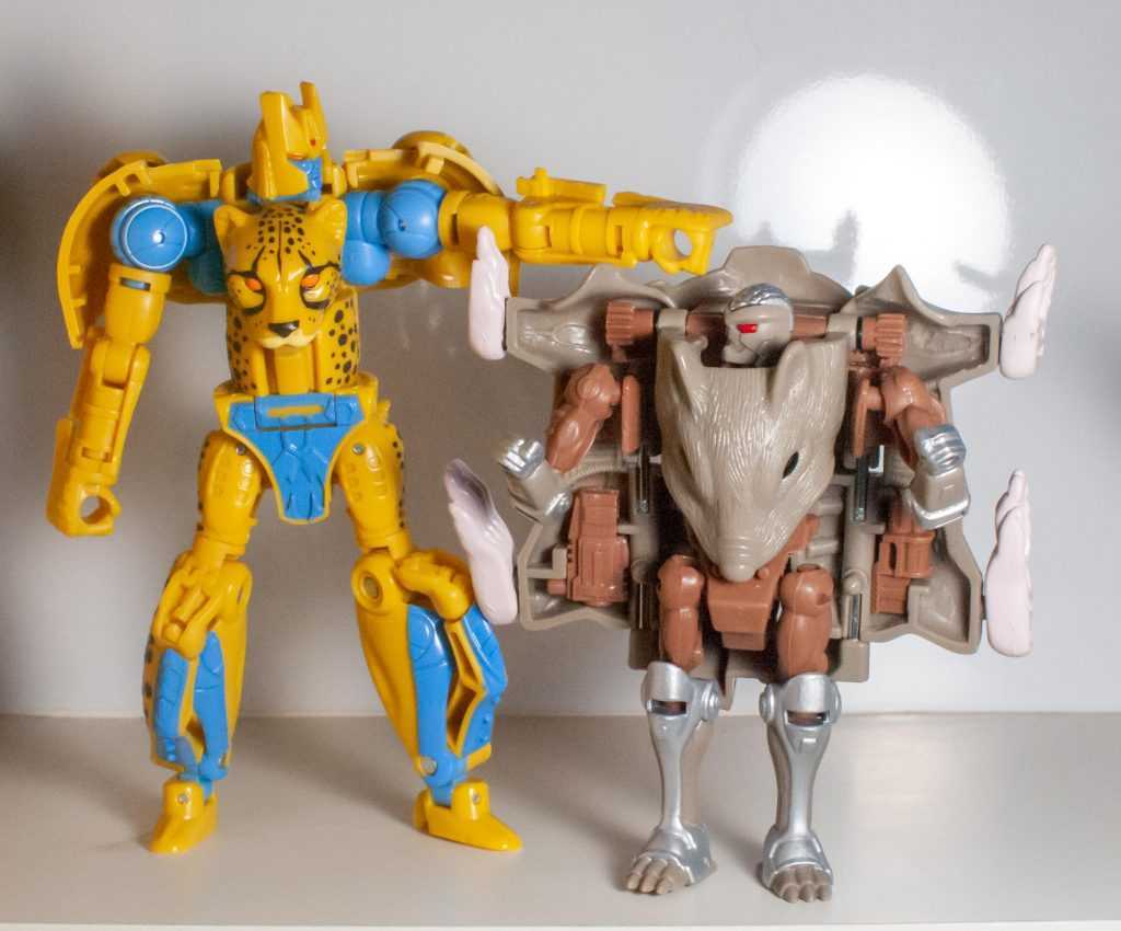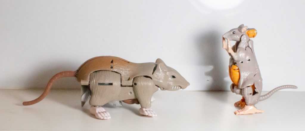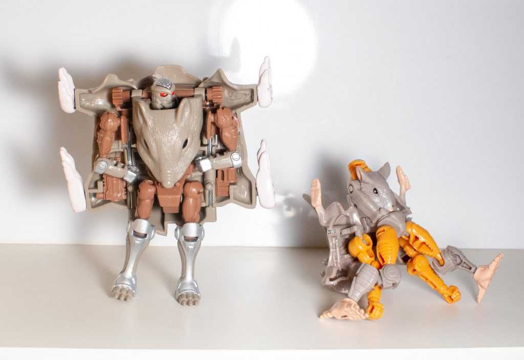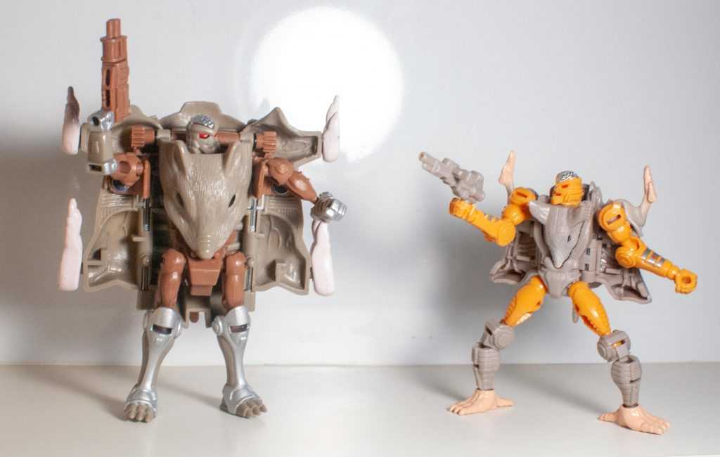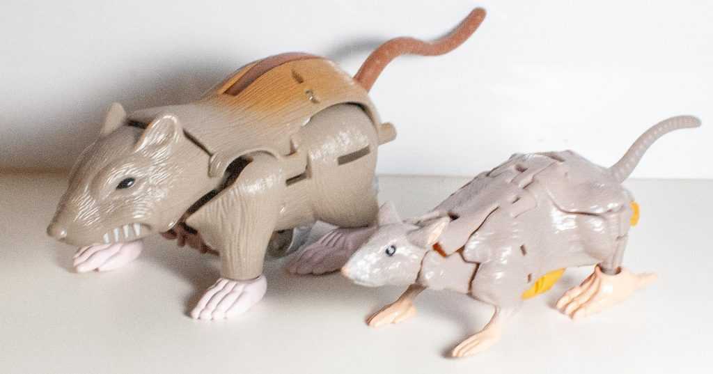 Their articulation is nearly identical, with the Kingdom figure gaining a slight edge with its ankle tilts, which also make it more stable. On the other hand, the Kingdom figure has shoulders that love to come out of position thanks to its transformation, whereas the Vintage figure is far more sturdy. In addition, the Vintage figure has that cool split-apart, hidden weapon, while the Kingdom figure just has a single-piece gun that can clip on his back (and can’t be stored in rat mode, unless it’s on his hip to shoot from).