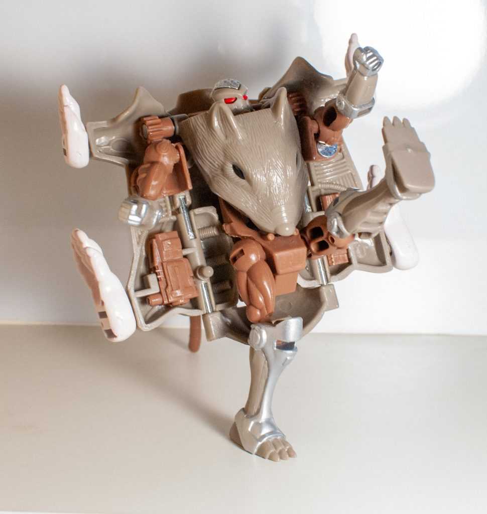 On the Vintage guy, this is the big event, the gimmick he was shaped around. Just pull the tail, and he changes from Rat to Robot in one step. Or rather, he should. Often something gets caught, and I have to flex his tail joint out and in, or manually adjust the last bit of the transformation.