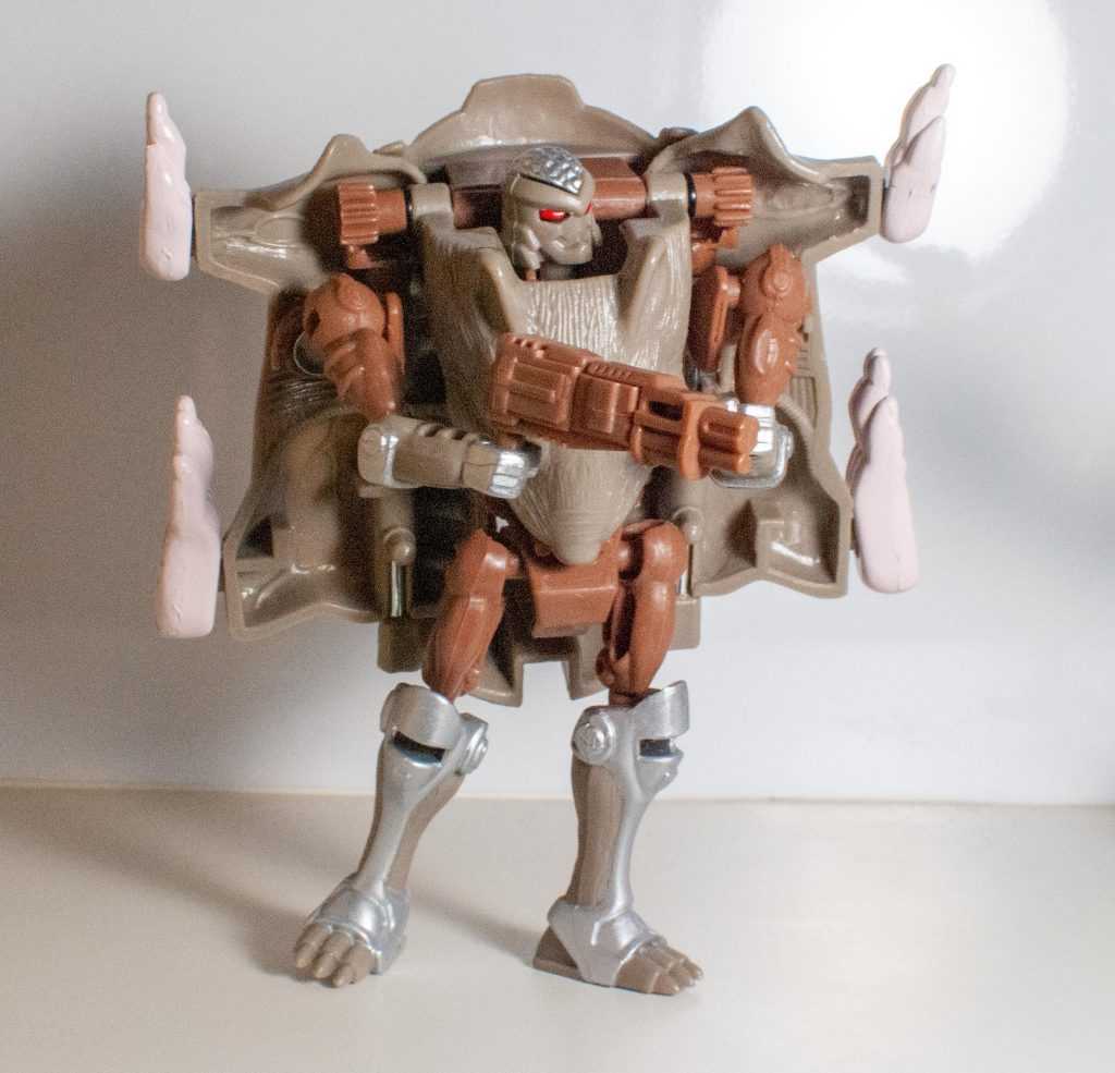 For additional accessories and gimmicks, Rattrap’s got a neat one: He’s got a two-part gun, stored in a hole on either side of his backpack. You can pop the two gun halves out, and fit them together to make a little brown pistol.