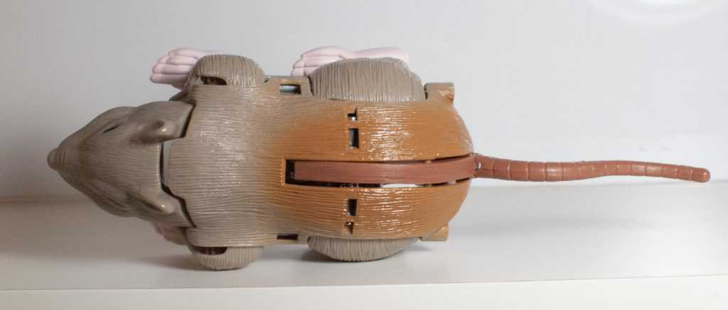 For colors, he’s mostly solid grey, but has a really nice brown fade towards the back (and a brown tail), along with pink feet, black eyes, and nasty-looking sharp white rat teeth. I do wish his nose wasn’t just unpainted grey plastic, though.