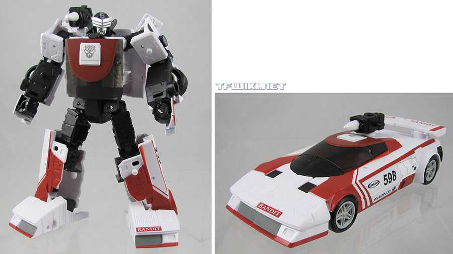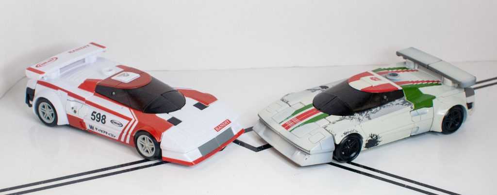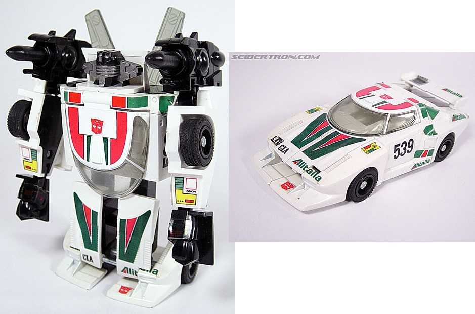 And sure enough, Wheeljack changes into a rally race car that’s almost, but not quite a Lancia Stratos, but again, looks right to my eyes unless I’m looking at screenshots. He’s got a kind of swooshy, curved cockpit, a spoiler in the back, that interesting-looking two rows of indents on his hood, and other Wheeljack-y details. Near as I can tell, the difference between the real car and this one is, again, this is more of a rectangle on wheels, and the real car’s a lot more curved, and even swooshy-er.