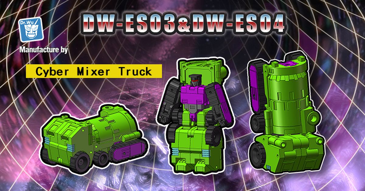 Dr WU’s Workshop enters the Devastator Combiner Wars of 2025 with the reveal of their DW-ES03 Cyber Shovel Loader and DW-ES04 Cyber Mixer Truck figures. The unofficial micro scale 5.6 cm / 2.2 inch tall figures for Mixmaster and Scrapper are confirmed as an eventual combiner set with the included accessories. Look for these to be released late in 2025. See the translated update and preview render image from Dr WU for the full reveal. DW-ES03, Cyber shovelloader DW-ES04, Cyber Mixer Truck. 5.6cm tall, it becomes a Cyber Devi combination with grounded ankle joints. All Devi combination accessories can be mounted on the vehicle. It is expected to be released at the end of the year. <br> See more at https://tformers.com/54798 <br>