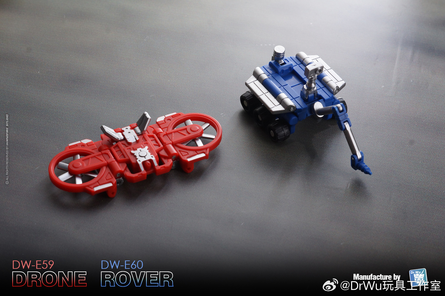 Dr Wu have announced, via their Weibo account, a reissue of their DW-E59 Drone & DW-E60 Rover (Cassette Drones For Siege/Netflix/Legacy Soundwave). These small cassettebots were released 6 years ago, We have a small 6-wheeled blue scout drone (slightly based on G1 Soundwave’s Autoscout) and red flyng drone which are compatible with any Siege/Netflix/Legacy Soundwave mold. To top it all, a new militar green variant DW-E59G Drone & DW-E60G Rover will also be released. See the images after the jump and then sound off on the 2005 Boards!
