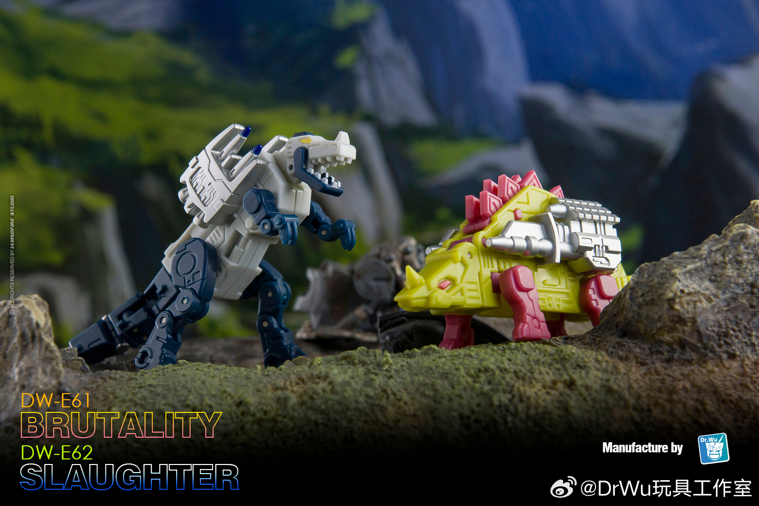 Third Party company Dr. Wu have revealed, via their Weibo account, image of the color prototypes of their upcoming DW-E61 Brutality & DW-E62 Slaughter (G1 Slugfest & Overkill). These are new cassettes planned to go with the Siege/Netflix/Legacy Soundwave mold and they are based in the G1 dino-robocasettes Overkill and Slugfest. We have clear shots at their cassette and dino modes, and the weapons included. According to the information shared on Weibo, they should be released in about one month. See the images after the break and and share your impressions on the 2005 Boards!