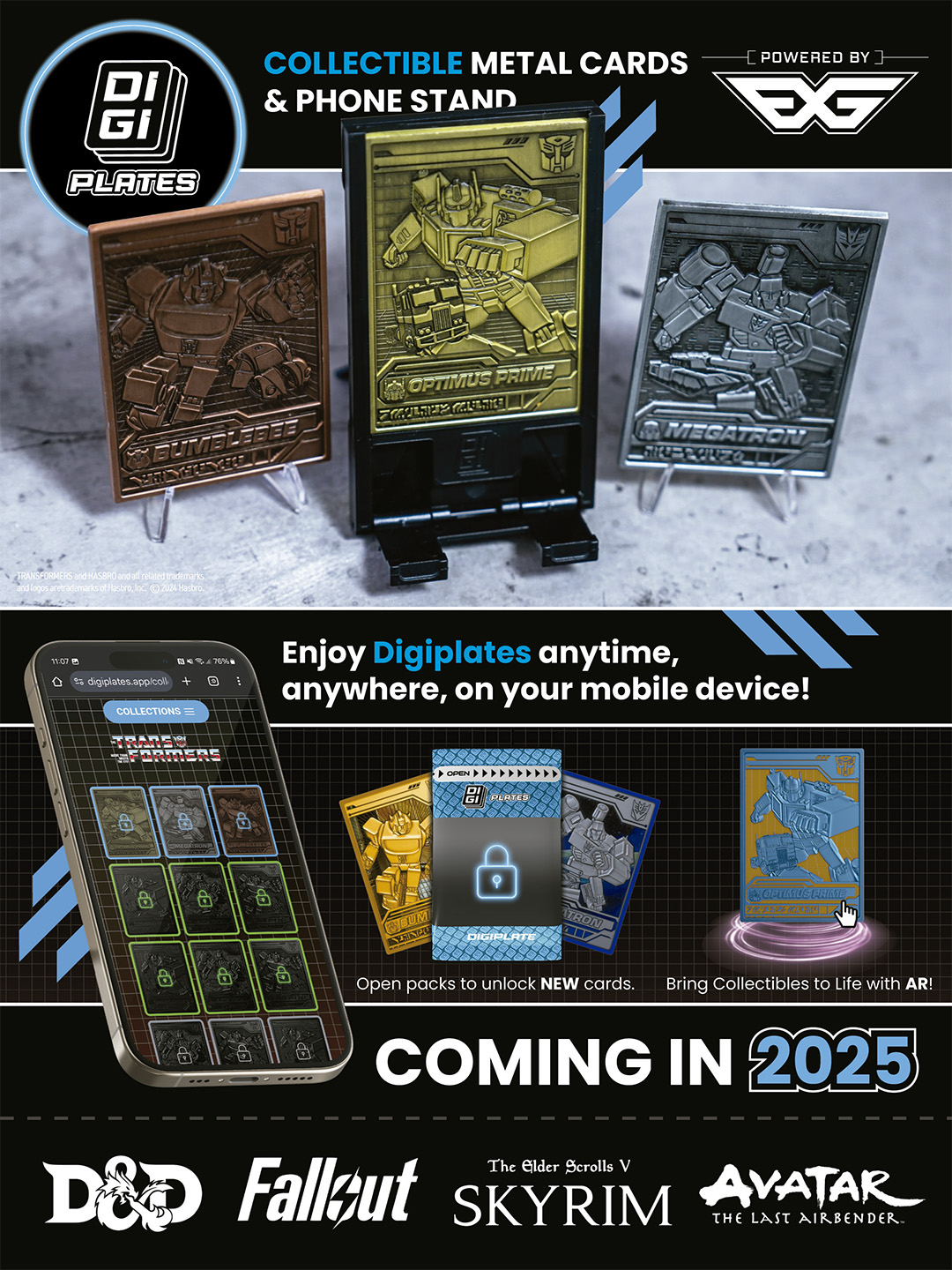 Via The Pop Insider Magazine we have our first image of the upcoming EXG DIGIPLATES Transformers Digiplate Starter Pack. This is a set of 3 metal cards featuring Optimus Prime, Megatron and Bumblebee plus a phone stand which can display one of the aforementioned cards. You can also activate AR features by scanning each plate for interactive experiences. We still have no concrete information about price or release date, but similar packs have been offered for £24.99 ($31.62 USD approximately). See the promotional image after the break and then sound off on the 2005 Boards!