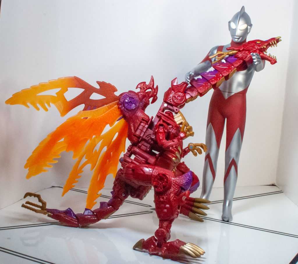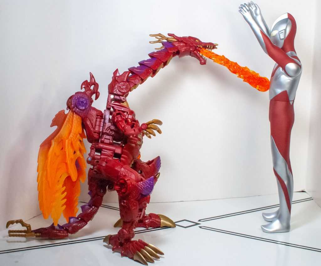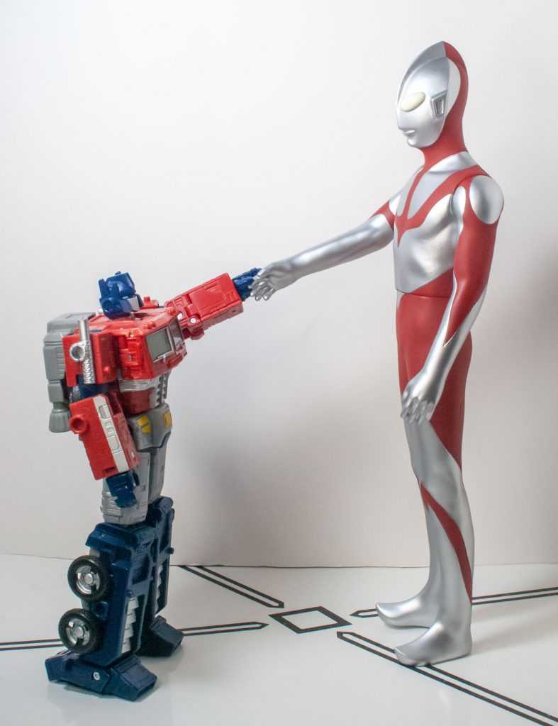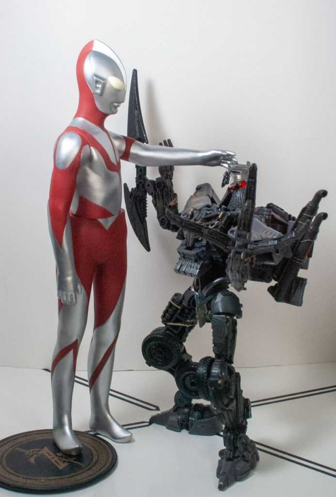 Ultraman’s jumbo-sized compared to most action figures, but not too tall. Sure, he he towers above most Transformers, even the taller Leader-class figures. But he’s a pretty skinny humanoid (that skinniness is a part of his redesign), so he doesn’t take up too much shelf space, and that larger size makes him feel like he scales well with a lot of the other stuff in my collection.