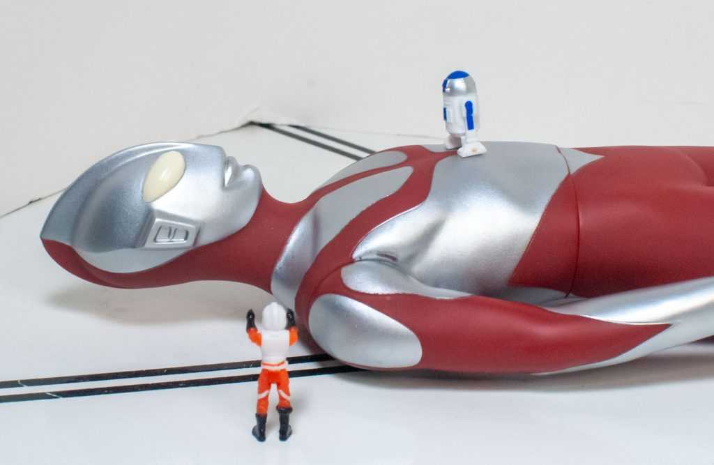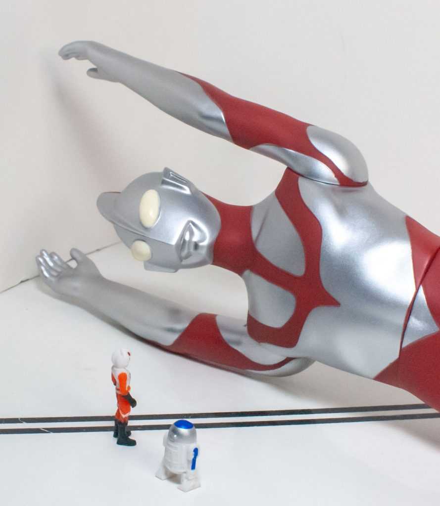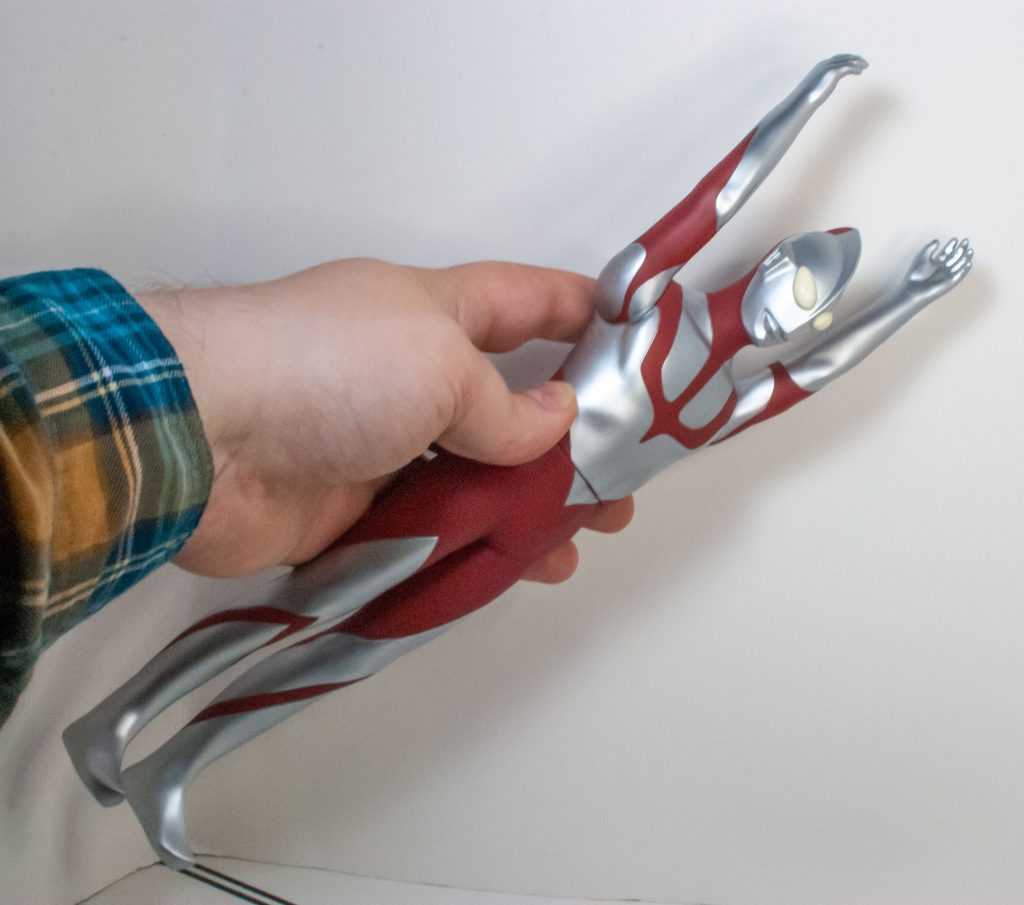 Now, there’s a good deal of merchandise for Ultraman, like any Popular Japanese thing. There’s expensive high-end SH Figuarts, there’s more mass-released Ultra Action Figures, and there’s stuff like today’s subject, a big Vinyl of the big man himself. Vinyl’s a thing I’m wholly unfamiliar with, but I know about it as a historical Kaiju Toy Delivery System. Basically, they’re Big Rubber Toys of Giant Monsters. Godzilla was made to be rendered this way. These days, there’s an entire market for these things amongst collectors as much as kids. All I know is they’re big, cheap, made of a kind of soft material (sometimes they’re called Sofubi because of that), and tend to be only marginally articulated, if at all. And lo and behold, my local Gamestop (which has gotten heavily into the Anime and Tokusatsu scene) had this guy on the shelf for a fairly modest $25 Canadian. I could have gone a more traditional action figure route, but this guy won out for being on sale in front of me in person. Plus, I get to see what I think of an entire collecting scene I’m unaware of.