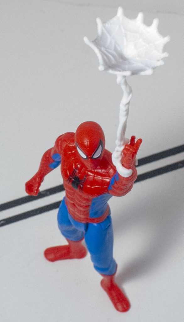 For accessories, Spidey’s got exactly one: A white, nicely-sculpted strand of webbing, with a big explosive splat on the end. He interacts with it via a handcuff-like clip that fits over his wrist, which is a novel way to keep it on there, and stable. I kind of wish the end was red, to blend it into his arm more, but on the other hand, you can hand this off to almost any other figure in this line, so maybe neutral white was the best call. Meanwhile, his one hand that isn’t sculpted shooting web is half-open, to accept an accessory he doesn’t have.