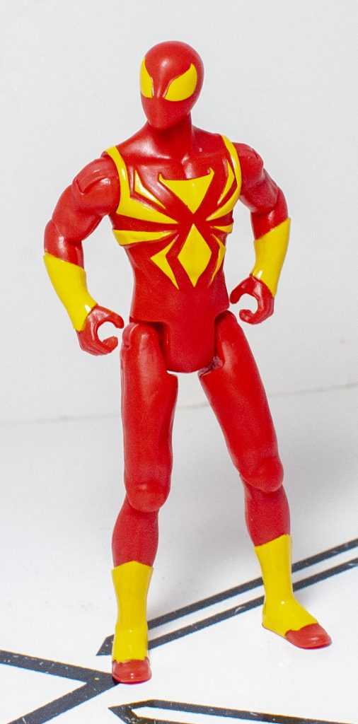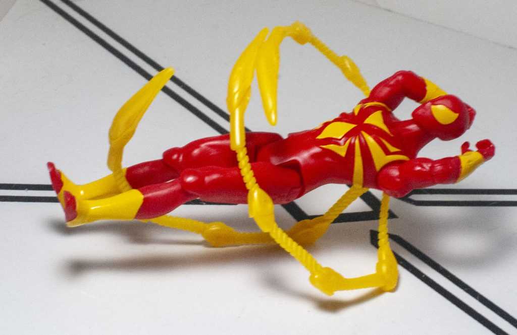 The other surprising thing is how the sculptwork and colors interact. See, Iron Spider’s only two colors, a lighter orangy-red plastic, and mustard-yellow paint, a striking combo. But what’s interesting is that they didn’t slap that yellow paint on a blank body. Everything that’s colored, including his angular eyes, the inverted spider logo on his chest, even the trim on his gloves and boots, are raised bits of sculptwork.
