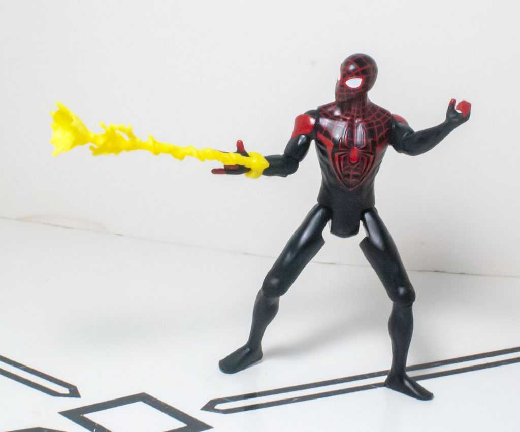 He’s got that same great articulation as the other small guys in this line, his webbing hand and accessory holding hand are in the Miles Morales Configuration (they’re not literally the same parts, though), and his lone accessory is another wrist-mounted web-shot. Specifically, it’s the questionable-looking yellow electrical blast from Miles, but repainted into a more sensible white.