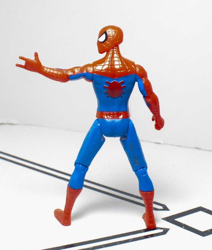 Truth be told, most of this toyline manages to avoid obvious signs of cost-cutting, but not this guy, when it comes to his colors. He’s got all the red and blue in the right spots, both painted and plastic, a black spider-logo on his chest, and eyes painted white, outlined in black (and they’re sculpted in, too!), but those webbing patterns are totally uncolored, and, despite the sculptwork trying to bring them out, kind of vanish into the red of the costume.