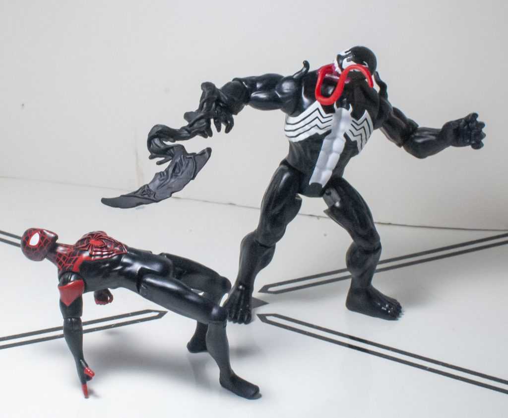 Seriously, he’s half a head taller than the Parkers and the Miles, and feels like he’s made of double the plastic, between his barrel torso and thick limbs. He’s got a monstrous, muscular sculpt going on, with a couple of sticky-out bits on his shoulders that suggest he’s still partially a liquid symbiote.