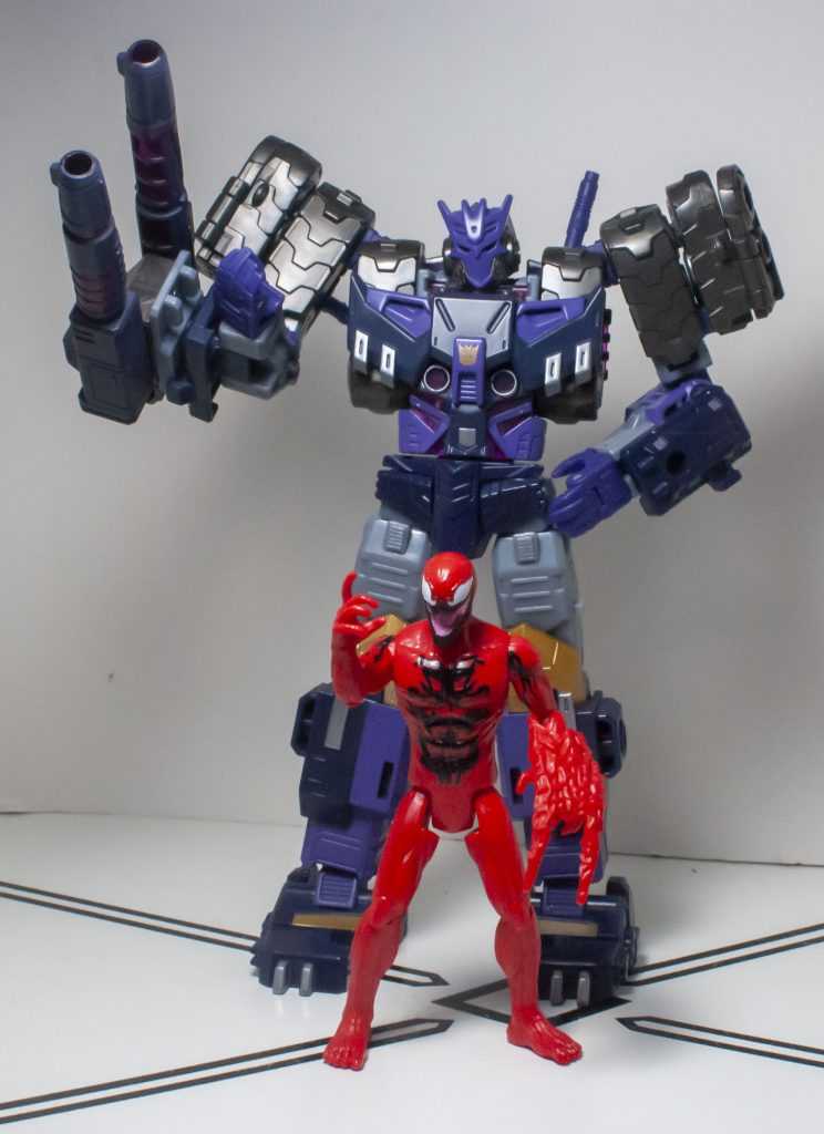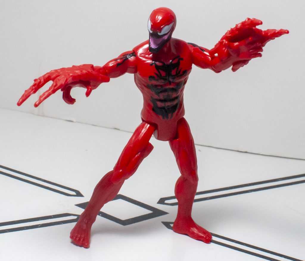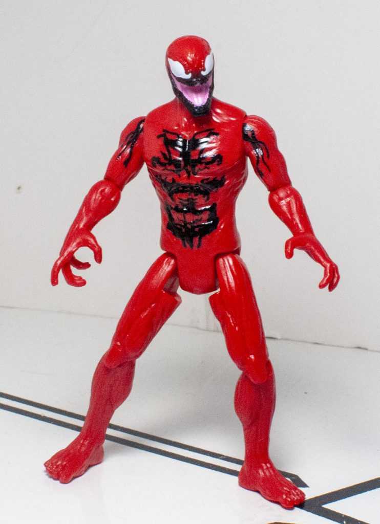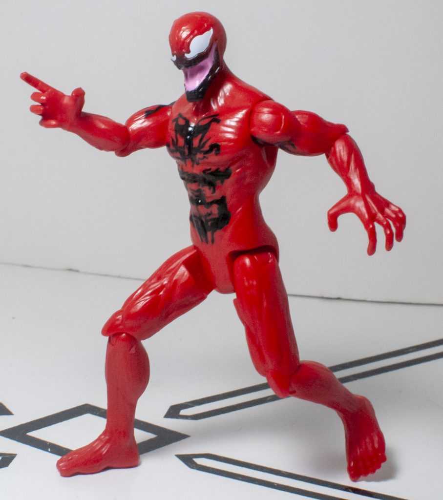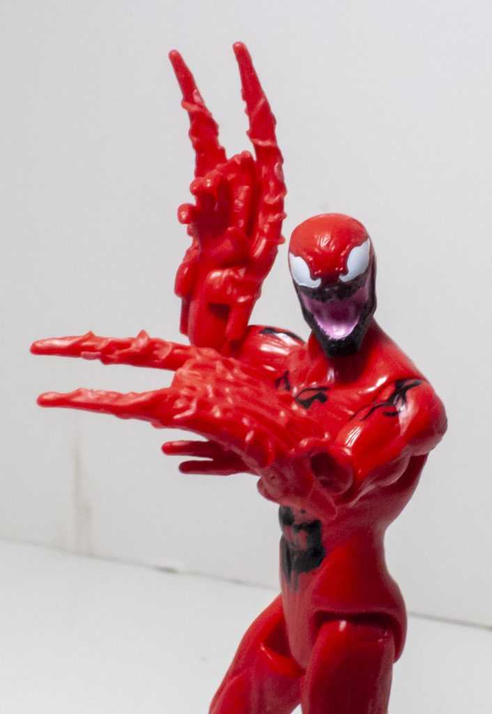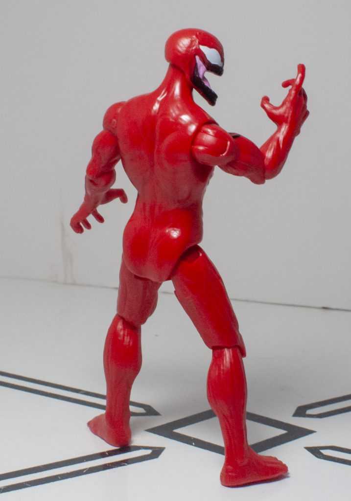 So, rather than being Venom-sized, Carnage is the same smaller scale as the rest of the line. However, the sculptwork on him is totally different, and really gnarly looking.