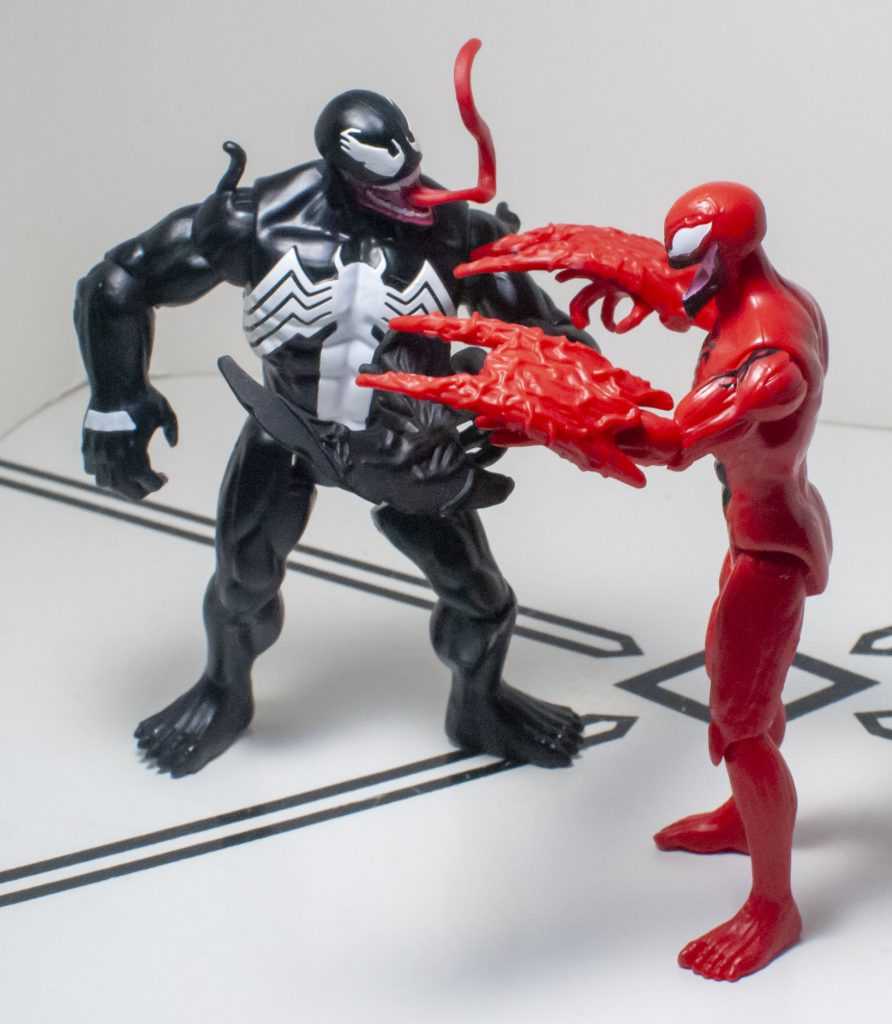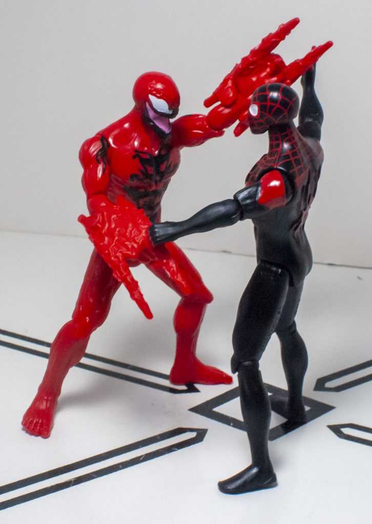 All of these figure turned out pretty good, really. For one thing, you can’t beat the price they’re being sold at. But they also go above and beyond what you’d expect from this pricepoint, and this scale, and manage to be really poseable, expressive, and just plain fun. Remember fun? These are fun, and they make for good impulse purchases. Weirdly, I think Carnage is my favorite of the bunch, despite me not specifically being a Carnage fan. He’s just got something about him. I’d call Venom a close second, and he’s certainly the best when it comes to value-for-money. As for the heroes, I think Miles is mostly my favorite, it’s just the poor choice of accessory that kneecaps him a bit. Really, all of the Spider-Mans are pretty good. The regular Peter Parker version is the weakest, due to his obviously missing colors, but that’s sort of a “by default” kind of assessment, he still turned out pretty good.