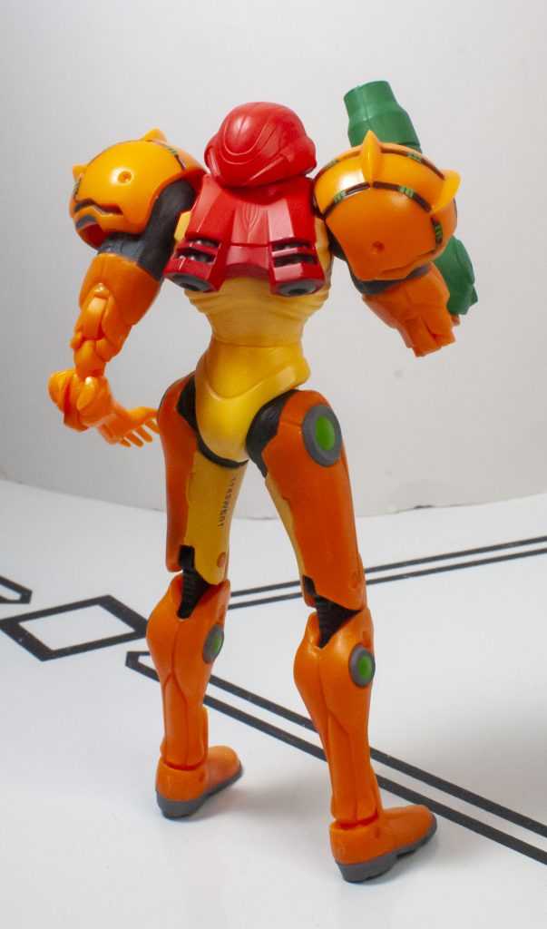 This is an area where the designers opted to take some liberties, even though they’re not liberties you’d immediately notice. To start with, this is a very nicely-colored figure. She’s mostly a kind of bright orange, and a sort of sandy yellow-brown, with red on her helmet, chest, and back, and a green arm cannon. Her accent colors are black, dark gray, and green, and she even has hits of paint that the older World of Nintendo figure didn’t, in the form of little green accents on her shoulders. One detail that I appreciate is the yellow gradient visible on parts of her arm cannon, meaning she has her starter weapon, the Power Beam, equipped.