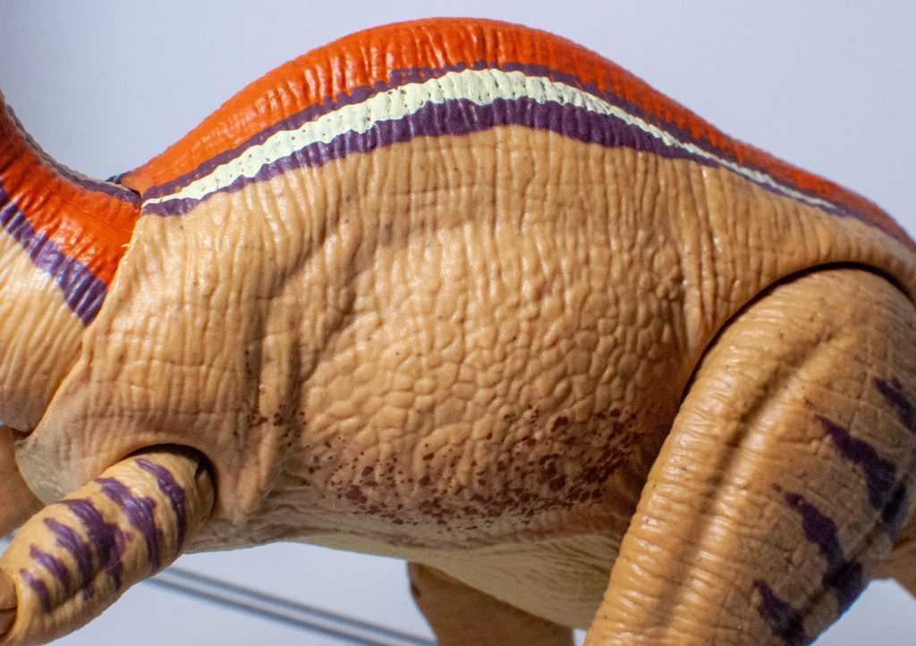The sculpt’s a nice, realistic design (well, “realistic,” I’m not a Dinosaur person, but I know the Jurassic films take liberties). So I guess I could say, it looks like it could be a real animal, like how the films portray their dinos, whether or not they really look like that. Getting closer, she’s really intricately sculpted, with scaled skin all the way down that feels coarse in your hands, and includes details like sculpted claws on her hands and feet.