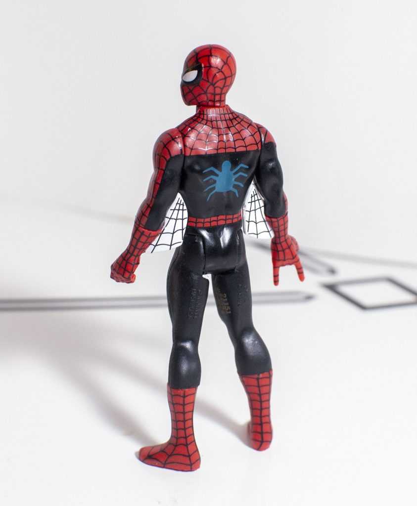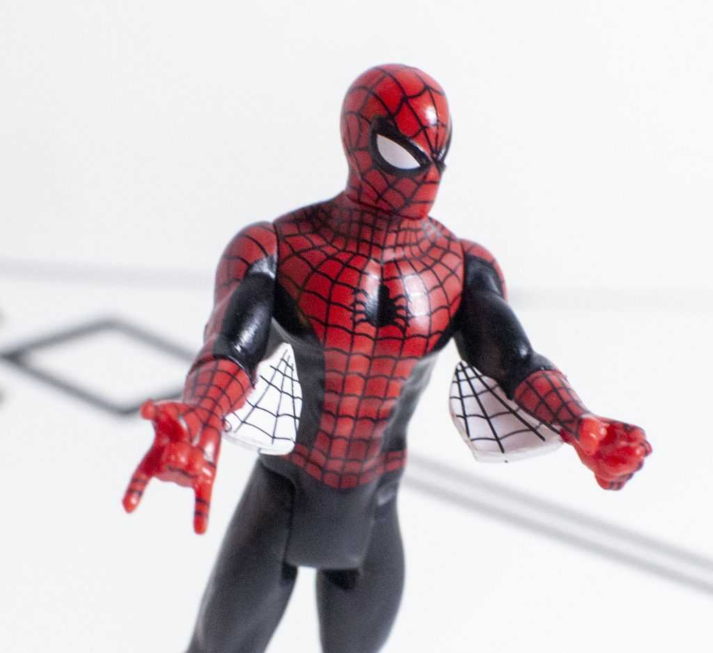 On the flipside, his deco is basically flawless, nothing was skipped. It’s the same Spider-Man suit colors everyone knows, only the undertones are black instead of blue, which, outside of being an early comics reference, just looks a little bit nicer to me. He’s got painted netting all over his body, white eyes with a black border, and a blue spider logo on back, to contrast the black one on his chest (an argument for taking him out of the box: Why would they paint a blue logo on his back that would otherwise be invisible?).