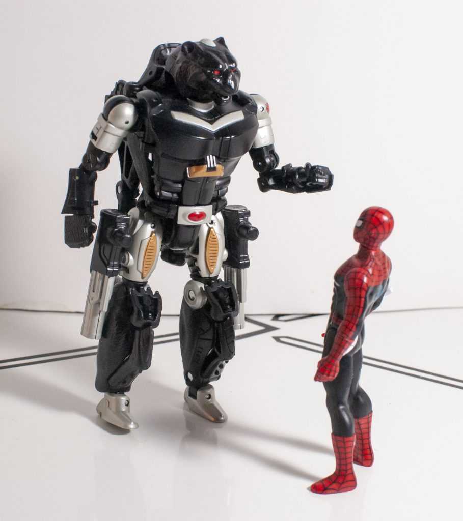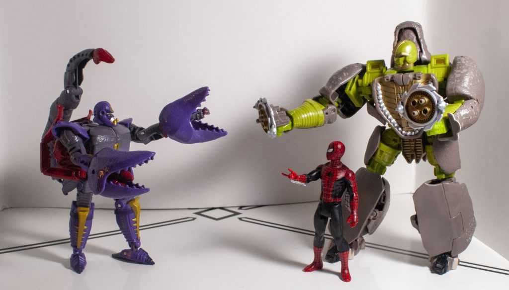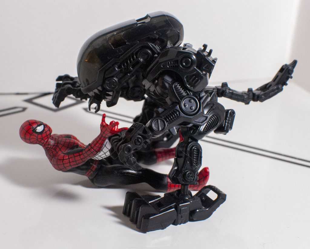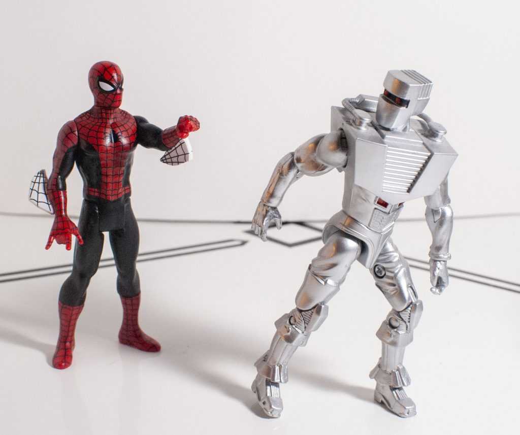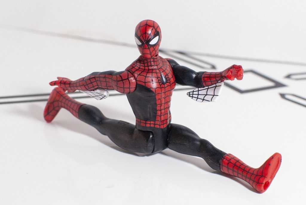 It’s a good bonus, because you can kinda-sorta rotate those pesky webs out of the way, and pose his web-shooting hand in different ways. I really wish his lower legs had the same swiveling feature, since the same plastic/rubber split is present. Outside of that, the only other thing to note about his articulation is that his legs can move backwards, unlike Super 7’s Hot Rod and Galvatron, so Spidey can do the splits.