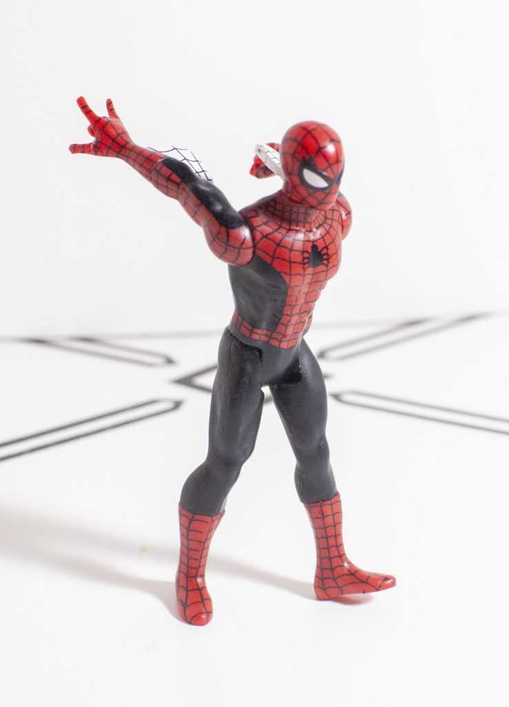 I’m not a toy designer, but my reflex would have been to either sculpt them so they’re attached to his torso instead, so they stay under his arms even when those arms are moved, or else just make them removable accessories, so they don’t have to stay stuck to his arms (I understand the 6-inch figure handles them this way). It smacks of the designers assuming I was going to keep him packaged, and never move those arms, so they didn’t need to actually make it work. That, and this is apparently a simple retool of the Spider-Man this Retro line already did, so these webs were seemingly added via replacing just the forearms, so it feels like they took the easiest way out possible, again, because I wasn’t supposed to unbox him.
