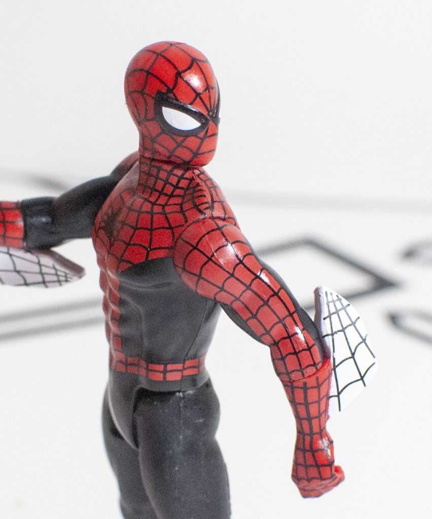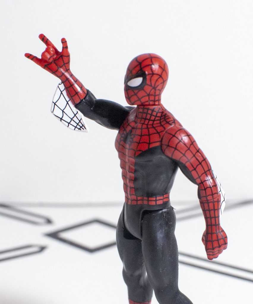 Meanwhile, his left hand is a fist with a hole for gripping accessories (not that he has any), and his right hand is posed in his throwing-up-the-horns web-shooting gesture, which is a good compromise.