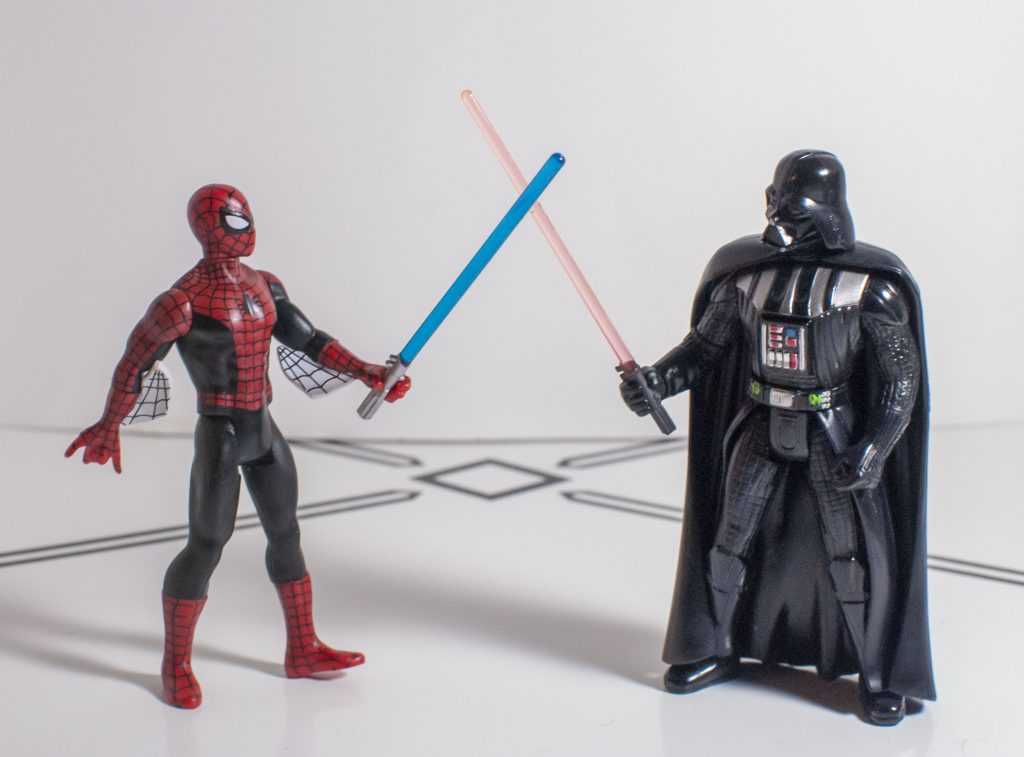 He’s actually getting ready to web Vader’s face and run.