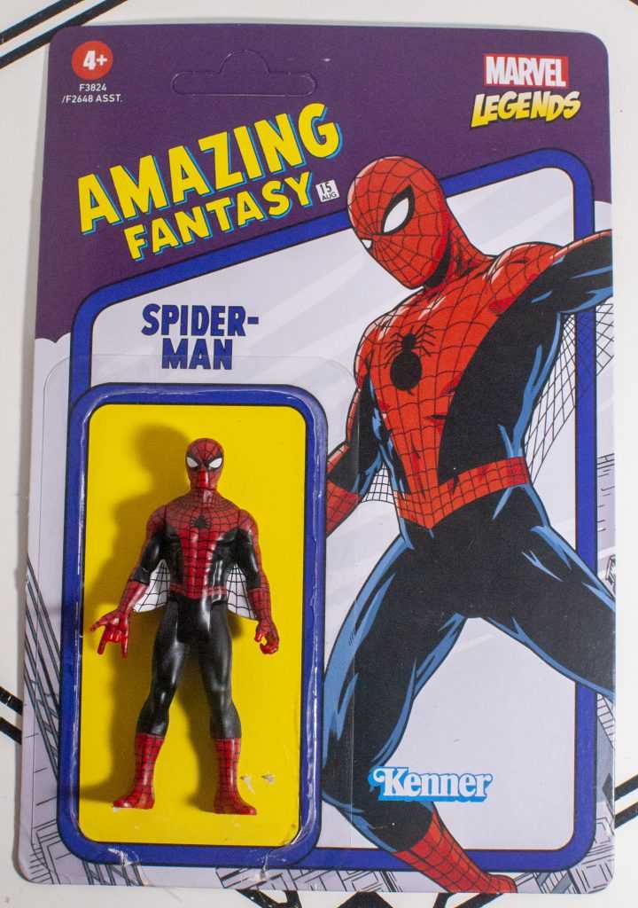 Luckily, it’s the 60th anniversary of Spider-Man right about now, so there’s a couple versions of this early design out there on the market, called “Amazing Fantasy Spider-Man,” after the magazine his first story appeared in. There’s a big six-inch Marvel Legend…which is either sold out, or hasn’t yet been released in Canada (I’m not used to hunting non-Transformers things), and there’s this little guy, part of the “Marvel Legends Retro Collection,” a series of 3.75 inch figures (so, Star Wars and GI Joe Scale), that say “Kenner” on the box, and are meant to look like vintage action figures, but aren’t actually based on any specific retro toyline. The idea seems to be “ReAction Figures are popular, let’s get in on this.”