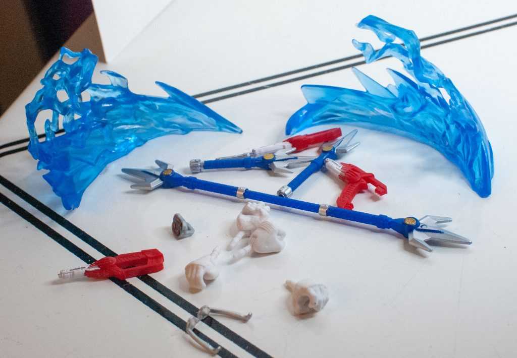 Next up, we have three accessories that initially confused me: Three entire variants of the Blade Blaster, the handheld, transforming weapon used by the Rangers. It’s named because it can either be a blade, or a blaster. All three are made of red plastic, and painted in white, and a bit of silver. The first, compressed one confused me, until I realized that it’s meant to specifically stay in the holder on his belt. I didn’t realize these things had a specific storage configuration, but it makes sense, I guess.
