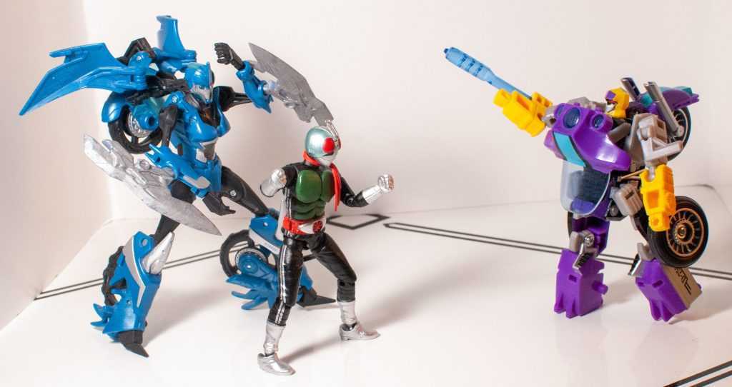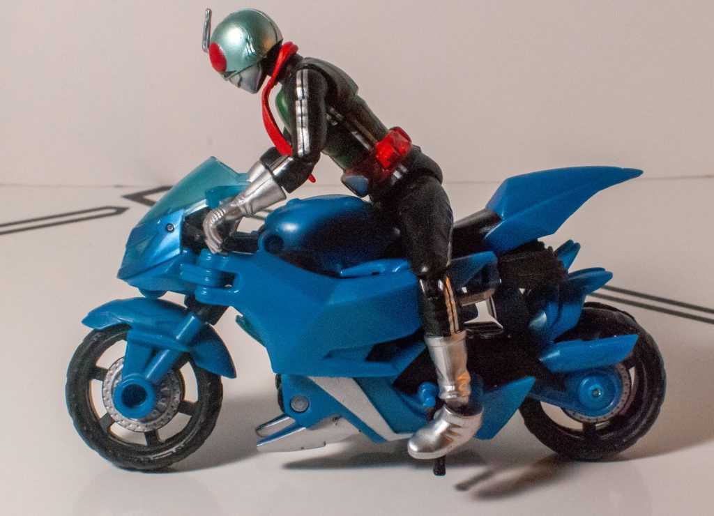 His gripping hands are really meant to clasp bike handles, though, since he’s the Kamen Rider, and motorcycling was a big part of the show (and the franchise, in general). There were a few Shodo bikes released that he’s able to interact with, though I don’t own them myself. I managed to get him to fit on Transformers Prime Arcee and Robot Masters Sideways’s bike modes pretty well, though.
