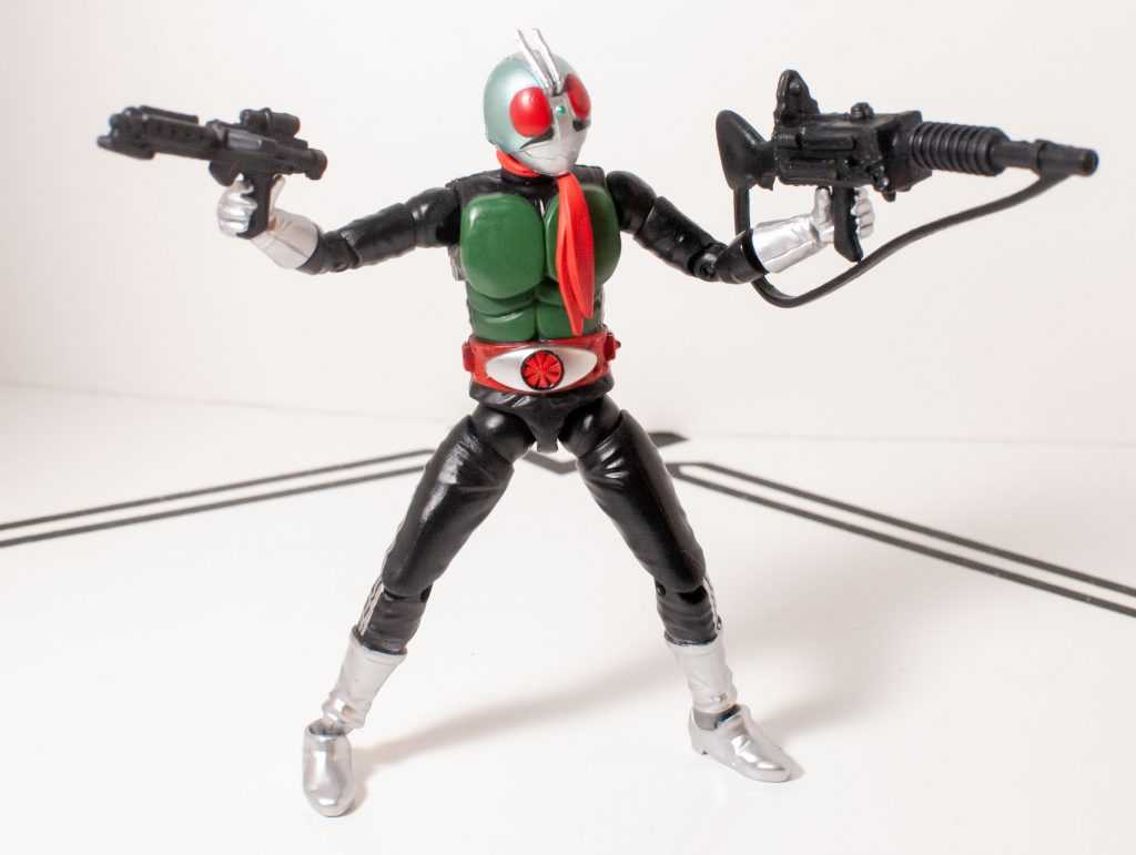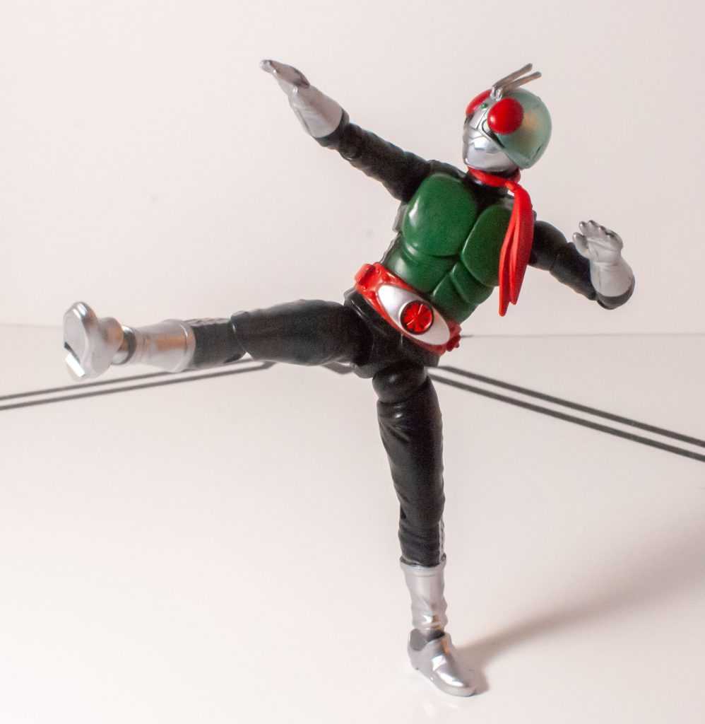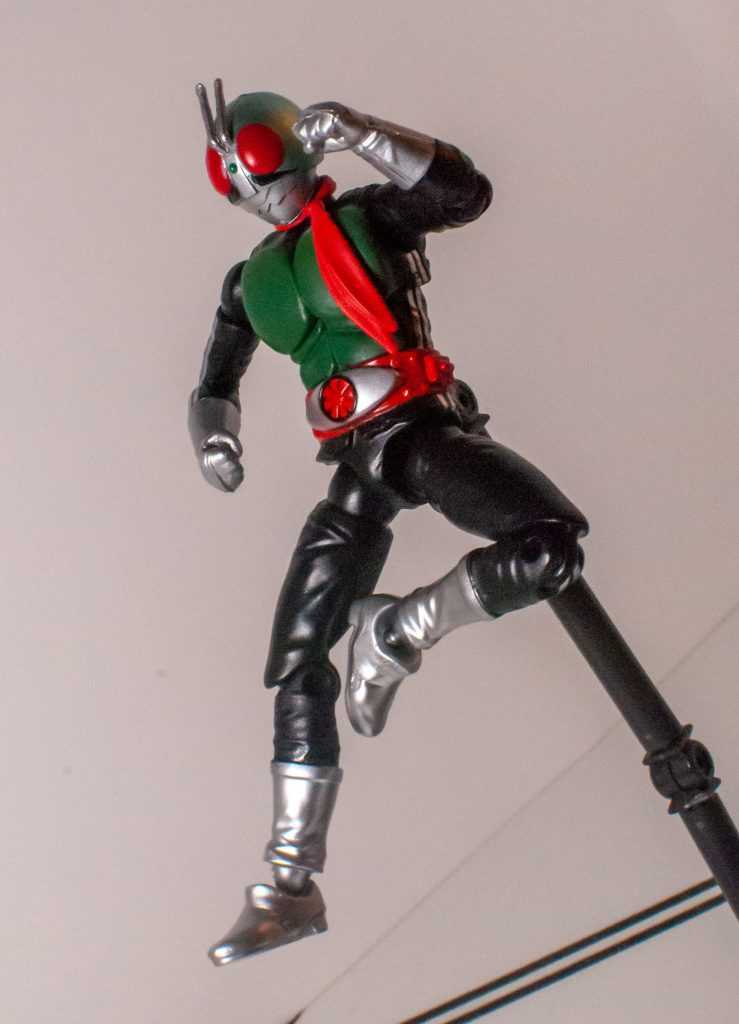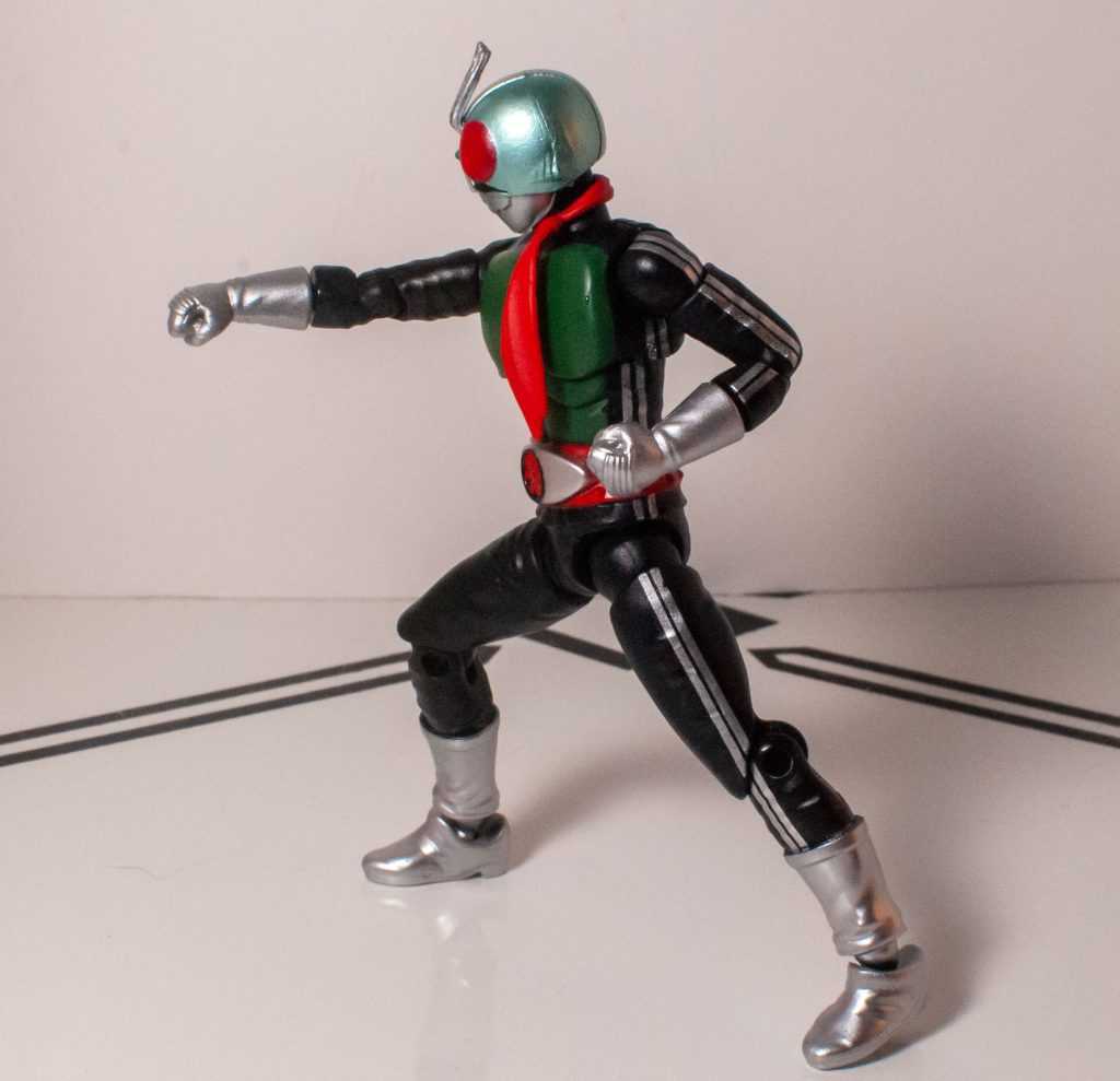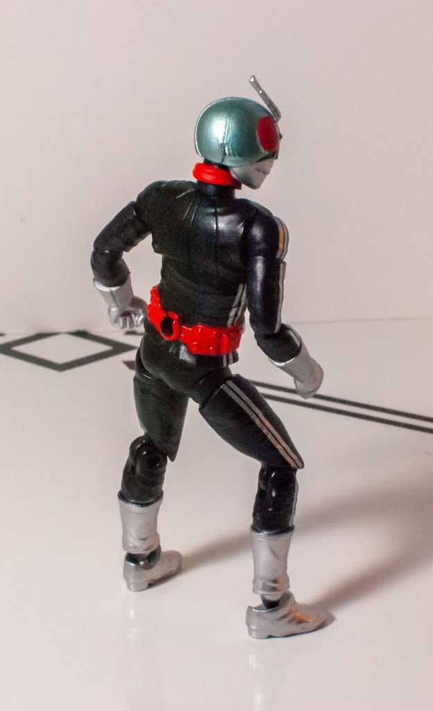 He’s got the insect helmet, the mouth plate, and the sculpted antenna uptop. He’s got the sculpted pecs and muscles upfront, his transformation belt with a ton of tiny details around the middle, and gloves and boots at the ends of his limbs. Those, and the undersuit, have nice little wrinkles in them. To finish the design off, he’s got his scarf dangling from his neck, a solid but semiflexible piece of plastic that hangs down across his chest (his antenna uptop are also a bit soft, for safety). Most of his joints are on the undersuit, hiding them pretty well, save for the ones on his ankles.The only bit of weirdness is his neck can look kind of long from a lot of angles. It’s an iconic, simple design, compared to a lot of the busier modern Kamen Riders, which means it scales down pretty perfectly onto this guy.