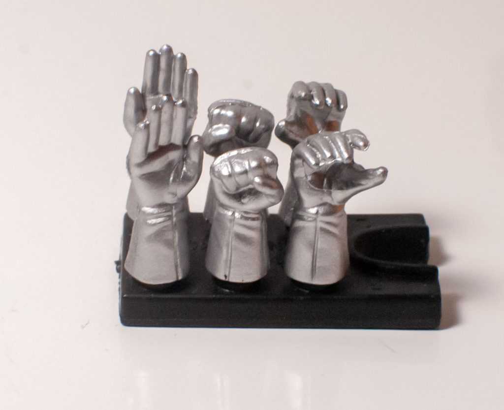 He’s got a stand, though! And it was handled in an interesting way. It’s a little slab, with a U-shaped cutout for the back of his foot, which you slide in. It’s very unobtrusive, and good for kicking. It’s also where you stash his other accessory: Swappable hands.