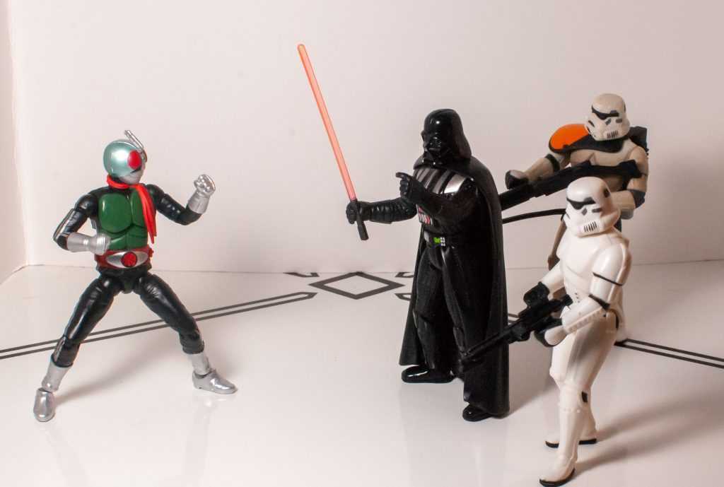 Importantly, the overall figure’s construction feels really solid. Not only is he the same size as Star Wars figures, he feels the same way in terms of durability. This isn’t fragile like a model kit, or Figuart, this is a knockaround action figure. That’s part of the reason I prefer Shodo to So-Do, that sense of durability. While I’m here, really quickly: So-Dos are slightly bigger, are full-on Model Kits with sprues, using stickers and paint for detail. Shodos are action figures, get all their detail from paint, and are slightly smaller.